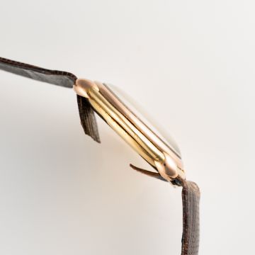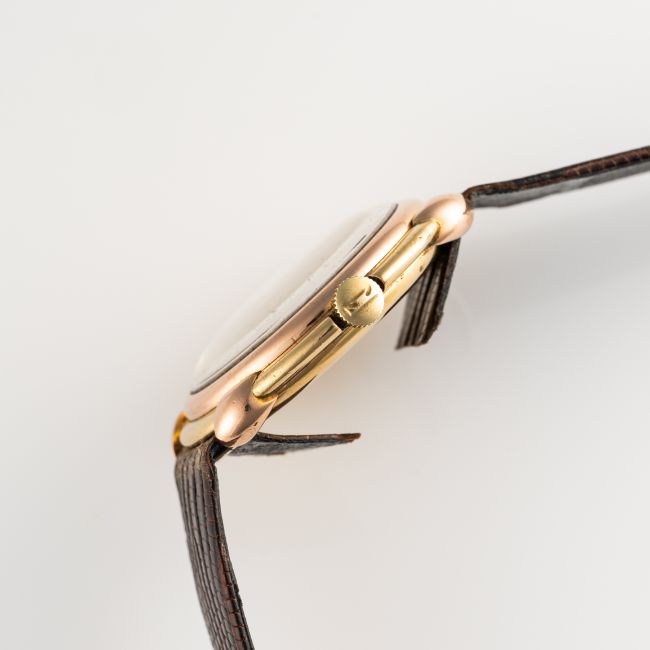 A RARE GENTLEMAN'S SIZE 18K SOLID YELLOW & ROSE GOLD ROLEX WRIST WATCH CIRCA 1930s, REF. 3167 Movement: 18J, manual wind Chronometer, signed Rolex timed 6 positions, patented super balance.Case: Diameter approx. 33.5mm, snap back, signed Rolex 31 World Records Universals, 18K hallmarks, numbered. Strap: Leather. CONDITION REPORTDial: Dial in excellent condition.Movement: Running & functioning at present, timekeeping and accuracy cannot be guaranteed.Case: In very good condition, with some scratches and wear due to general use.Strap/Bracelet: In excellent condition.