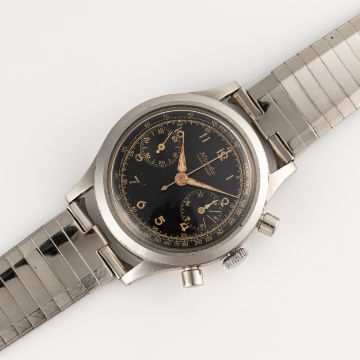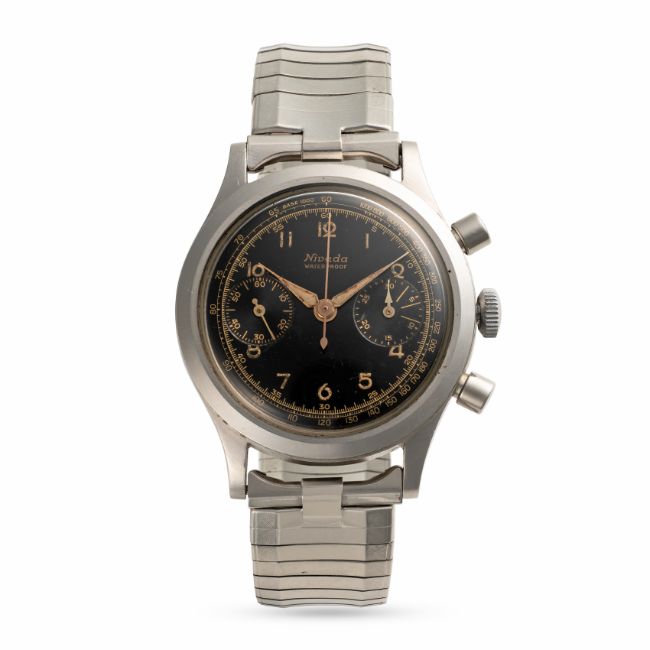 A RARE GENTLEMAN'S SIZE STAINLESS STEEL NIVADA GRENCHEN WATERPROOF CHRONOGRAPH WRIST WATCHCIRCA 1940s, WITH "CLAMSHELL" CASE & LUMINOUS GLOSS BLACK GILT DIALMovement: 17J, manual wind, Valjoux cal. 22. Case: Diameter approx. 36.5mm, case held by four screws, numbered. Strap: Stainless steel JB Champion USA bracelet.  CONDITION REPORTDial: Original dial in very good condition, showing some signs of age.Movement: Running & functioning at present, timekeeping and accuracy cannot be guaranteed.Case: In excellent condition, with light scratches due to general use.Strap/Bracelet: In excellent condition.