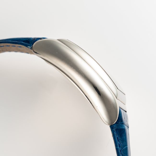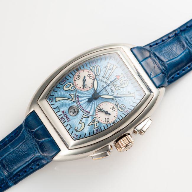 A RARE GENTLEMAN'S SIZE PLATINUM FRANCK MULLER KING CONQUISTADOR CHRONOGRAPH WRIST WATCH CIRCA 2010, REF. 8002 CC WITH LIGHT BLUE GUILLOCHE DIAL Movement: Automatic, signed Franck Muller.Case: Width approx. 40mm, signed Franck Muller Geneve, numbered, original crown & pushers.Strap: Franck Muller strap & original platinum pin buckle. CONDITION REPORTDial: Original dial in excellent condition.Movement: Running & functioning at present, timekeeping and accuracy cannot be guaranteed.Case: In very good condition, with some small scratches and wear due to general use.Strap/Bracelet: In very good condition.