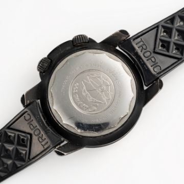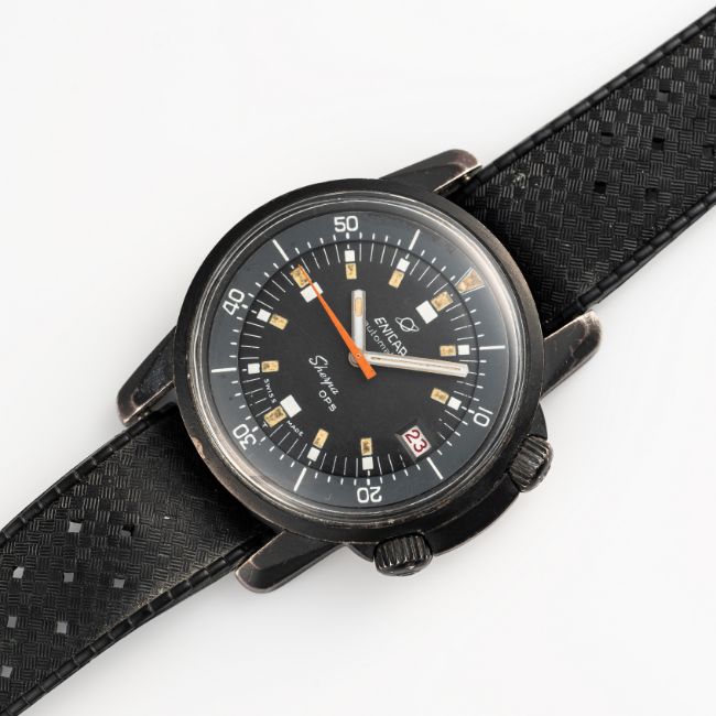 A RARE GENTLEMAN'S SIZE PVD COATED ENICAR SHERPA OPS DIVERS WRIST WATCH CIRCA 1960s, REF. 144/35/03Movement: Automatic, signed Enicar. Case: Diameter approx. 41mm, EPSA Super Compressor case with crown guard, Sherpa 600 emblem embossed on case back, signed Enicar, serial no. 72x,xxx, Enicar anti-slip crowns (top crown for inner rotating bezel not functioning).Strap: Rubber Tropic Sport. CONDITION REPORTDial: Original dial in excellent condition, showing some small signs of age/oil on the rotating inner bezel.Movement: Running & functioning at present, timekeeping and accuracy cannot be guaranteed.Case: In good condition, with some scratches & wear to the PVD due to general use.Strap/Bracelet: In very good condition.