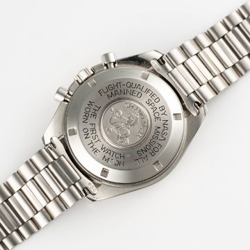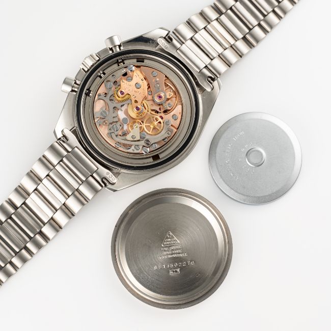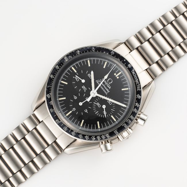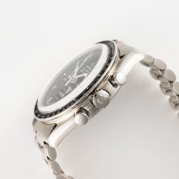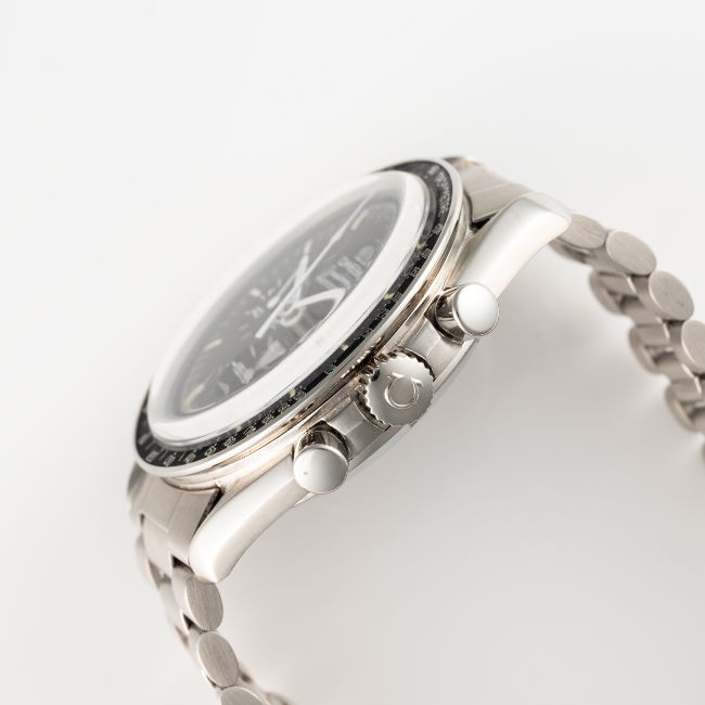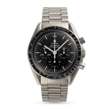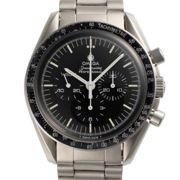 A GENTLEMAN'S SIZE STAINLESS STEEL OMEGA SPEEDMASTER PROFESSIONAL CHRONOGRAPH BRACELET WATCH CIRCA 1979, REF. 145.022-78 Movement: 17J, manual wind, cal. 861, signed Omega, numbered 44,8xx,xxx.Case: Diameter approx. 42mm, screw back, NASA moon landing tribute on case back, signed Omega Watch Co, dust cover, tachymetre bezel, Omega crown & pushers, Omega plexiglass.Bracelet: Omega stainless steel bracelet, numbered 1171/633. CONDITION REPORTDial: Original dial in excellent condition.Movement: Running & functioning at present, timekeeping and accuracy cannot be guaranteed.Case: In very good condition, with some light scratches due to general use, bezel has some signs of age.Strap/Bracelet: In very good condition showing some wear due to general use.
