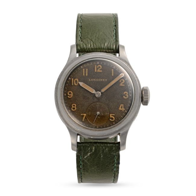 A RARE GENTLEMAN'S STAINLESS STEEL GERMAN MILITARY LONGINES D-H ARMY SERVICE WATCHCIRCA 1940s WW2, REF. 5130/22209 WITH TROPICAL BLACK LUMINOUS DIAL & HANDS, DELIVERED ON 15TH JANUARY 1943 TO COMPANY PAUL BAUERMEISTER (AGENT FOR LONGINES IN BERLIN) Movement: Manual wind, cal. 12.68Z, signed Longines, numbered 6,4xx,xxx.Case: Diameter approx. 32.5mm, stepped case, screw back with six notches, signed Longines, military markings, lug numbered matching case back.Strap: Leather. CONDITION REPORTDial: Original dial in very good condition, "tropical" dial aged to a brown colour.Movement: Running & functioning at present, timekeeping and accuracy cannot be guaranteed.Case: In excellent condition, with some small scratches due to use.Strap/Bracelet: In good condition.