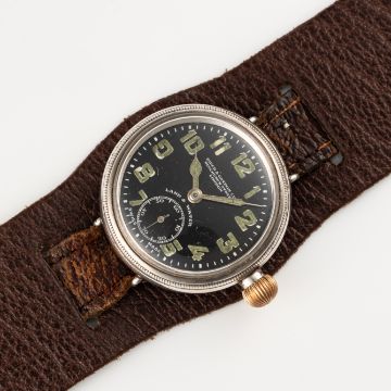 A GENTLEMAN'S SIZE SOLID SILVER ZENITH BIRCH & GAYDON LAND & WATER "OFFICERS" WRIST WATCH CIRCA 1916, BLACK ENAMEL DIAL WITH LUMINOUS ARABIC NUMERALS & "CATHEDRAL" HANDSMovement: Manual wind with swan neck regulator, signed Zenith, numbered 2,3xx,xxx.Case: Diameter approx. 35mm, two piece case with screw top, signed ZWC., Glasgow import silver hallmarks, numbered. Strap: Leather. CONDITION REPORTDial: Original dial in excellent condition.Movement: Running & functioning at present, timekeeping and accuracy cannot be guaranteed.Case: In very good condition, with some light scratches & wear due to general use.Strap/Bracelet: In excellent condition.