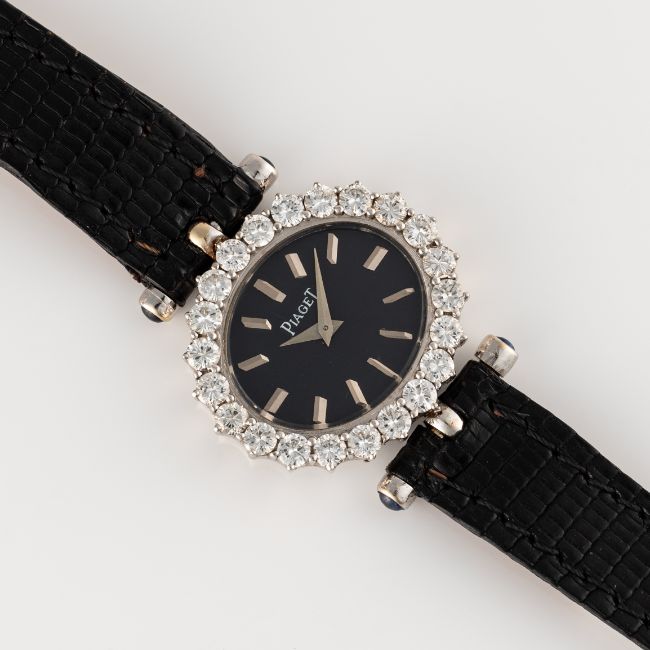 A LADY'S FINE 18K SOLID GOLD & DIAMOND PIAGET WRIST WATCHCIRCA 1970s, REF. 9330 RETAILED BY JEAN ETE PARIS Movement: 18J, manual wind, cal. 9P, signed Piaget, numbered. Case: Width approx. 28mm, two piece case with factory set diamond bezel, signed Piaget, 18k Swiss hallmarks, numbered.Strap: Leather strap with 18k solid white gold deployant clasp.  CONDITION REPORTDial: Dial in good condition, showing signs of age. Movement: Running & functioning at present, timekeeping and accuracy cannot be guaranteed. Case: In very good condition, with some light scratches due to general use. Strap/Bracelet: In very good condition.