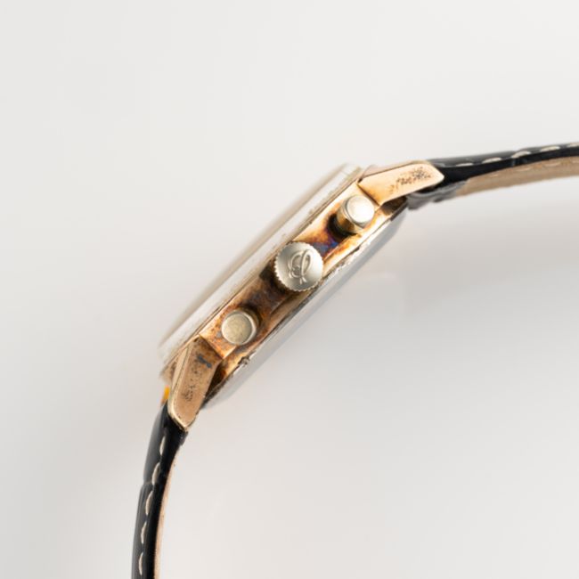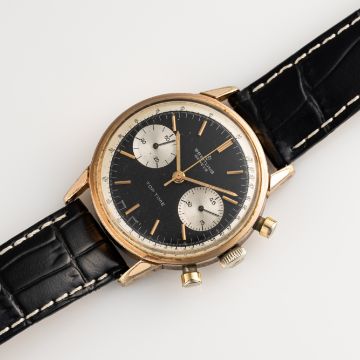 A GENTLEMAN'S SIZE GOLD PLATED BREITLING TOP TIME CHRONOGRAPH WRIST WATCH CIRCA 1960s, REF. 2000 WITH JAMES BOND "THUNDERBALL" DIALMovement: 17J, manual wind, Venus calibre, signed Breitling.Case: Diameter approx. 35mm, "Waterproof' steel snap back case, numbered, Breitling crown. Strap: Leather. CONDITION REPORTDial: Original dial in very good condition, small signs of age.Movement: Running & functioning at present, timekeeping and accuracy cannot be guaranteed.Case: In fair condition, with scratches and wear due to general use.Strap/Bracelet: In excellent condition.