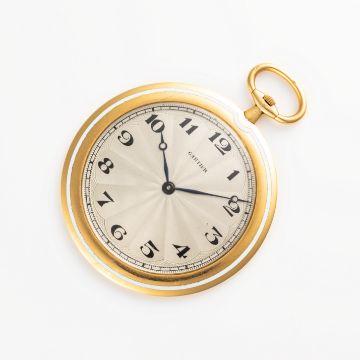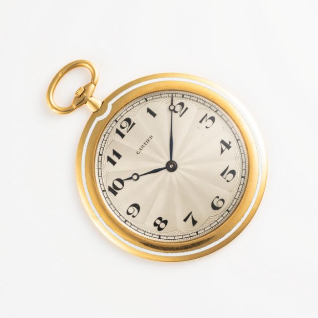 A FINE GENTLEMAN'S SIZE 18K SOLID GOLD & WHITE ENAMEL CARTIER ULTRA SLIM POCKET WATCHCIRCA 1930s, WITH GUILLOCHE DIAL & WHITE ENAMEL TO CASE Movement: Manual wind.Case: Diameter approx. 46.5mm, matching case back & case middle numbers, French gold import mark (owl). CONDITION REPORTDial: Dial in very good condition.Movement: Running & functioning at present, timekeeping and accuracy cannot be guaranteed.Case: In very good condition, with some light scratches and wear due to general use.