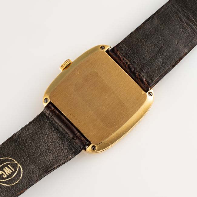 A GENTLEMAN'S SIZE 18K SOLID GOLD IWC WRIST WATCH CIRCA 1970, REF. 2572 Movement: Manual wind, cal. 423, signed International Watch Co, numbered 2,1xx,xxx. Case: Measures approx. 33mm by 31mm, signed IWC, 18k Swiss hallmarks, numbered 2,1xx,xxx. Strap: IWC leather strap with unsigned pin buckle. CONDITION REPORTDial: Original dial in excellent condition.Movement: Running & functioning at present, timekeeping and accuracy cannot be guaranteed.Case: In very good condition, with some light scratches due to general use.Strap/Bracelet: In very good condition.
