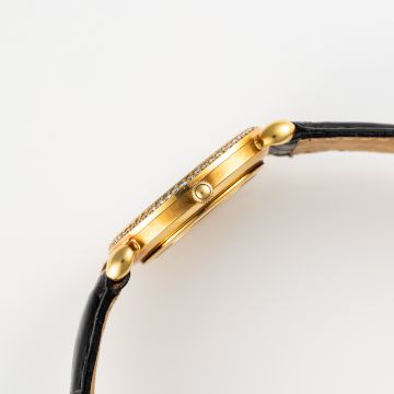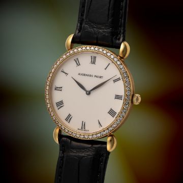 A FINE 18K SOLID GOLD & DIAMOND AUDEMARS PIGUET WRIST WATCHCIRCA 1990s, WITH PORCELAIN DIAL Movement: 20J, manual wind, cal. 2080, Audemars Piguet, numbered.Case: Diameter approx. 32mm, snap back, signed Audemars Piguet, factory set diamond bezel, 18k hallmarks, numbered. Strap: Leather. CONDITION REPORTDial: Original dial in excellent condition.Movement: Running & functioning at present, timekeeping and accuracy cannot be guaranteed.Case: In very good condition, with some light scratches due to general use.Strap/Bracelet: In very good condition.
