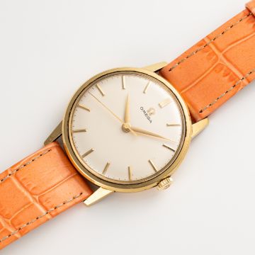 A GENTLEMAN'S SIZE 14K SOLID GOLD OMEGA WRIST WATCH CIRCA 1960, REF. 14702 Movement: 17J, manual wind, cal. 285, signed Omega, numbered 17,8xx,xxx.Case: Diameter approx. 34mm, snap back, signed Omega Watch Co., 14k hallmarks, Omega crown & plexiglassStrap: Leather. CONDITION REPORTDial: Original dial in excellent condition.Movement: Running & functioning at present, timekeeping and accuracy cannot be guaranteed.Case: In very good condition, with some light scratches and wear due to general use.Strap/Bracelet: In very good condition.