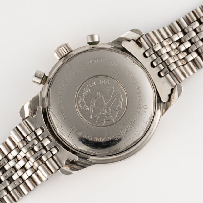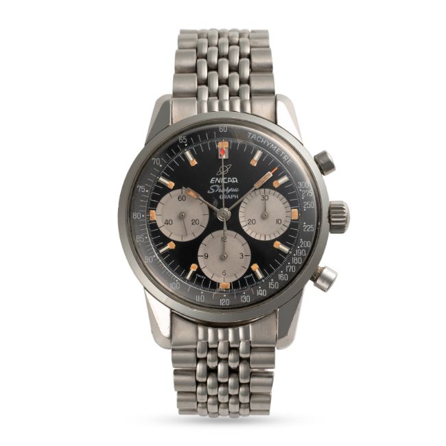 A RARE GENTLEMAN'S SIZE STAINLESS STEEL ENICAR SHERPA GRAPH CHRONOGRAPH BRACELET WATCH CIRCA 1960s, REF. 072-02-01 MARK III BLACK DIAL WITH GREY REGISTERSMovement: 17J, manual wind, Valjoux cal. 72, signed Enicar.Case: Diameter approx. 40mm, EPSA Compressor case with bajonet lock, Sherpa 300 emblem embossed on case back, signed Enicar, serial no. 90x,xxx, Enicar anti-slip crown.Bracelet: Enicar "BoR" stainless steel bracelet.  CONDITION REPORTDial: Original dial in excellent condition, showing some small signs of age.Movement: Running & functioning at present, timekeeping and accuracy cannot be guaranteed.Case: In very good condition, with some scratches & light wear due to general use.Strap/Bracelet: In excellent condition, with light scratches.