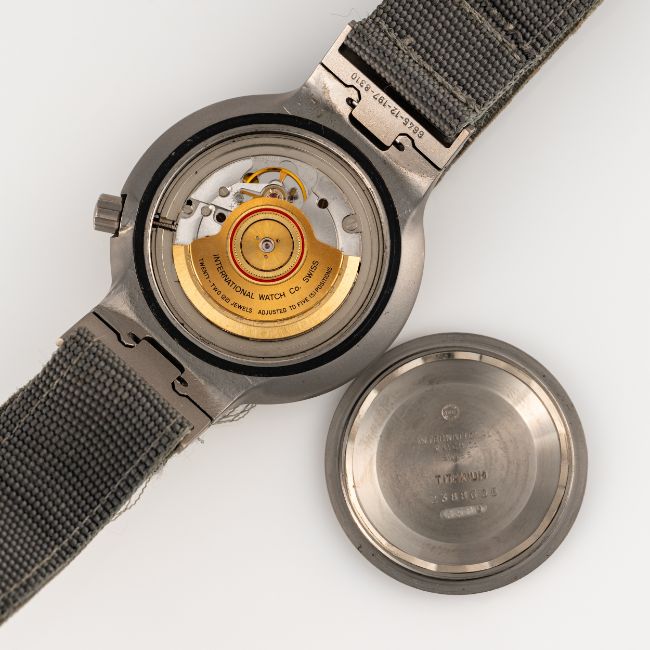 Case: Diameter approx. 43mm, screw back, signed International Watch Co, numbered, issue markings BUND 6645-12-197-8096, rotating bezel, screw-down crown.