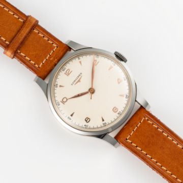 A RARE GENTLEMAN'S LARGE SIZE STAINLESS STEEL LONGINES CENTRE SECONDS WRIST WATCHCIRCA 1952, REF. 5045-13 WITH ROSE GOLD MARKERS & FEUILLE HANDS Movement: 17J, manual wind, cal. 12.68ZS, signed Longines, numbered 8,5xx,xxx.Case: Diameter approx. 37.5mm, snap back, signed Longines.Strap: Leather. CONDITION REPORTDial: Original dial in excellent condition, showing some very small signs of age.Movement: Running & functioning at present, timekeeping and accuracy cannot be guaranteed.Case: In excellent condition, with some light scratches due to occasional use.Strap/Bracelet: In very good condition.