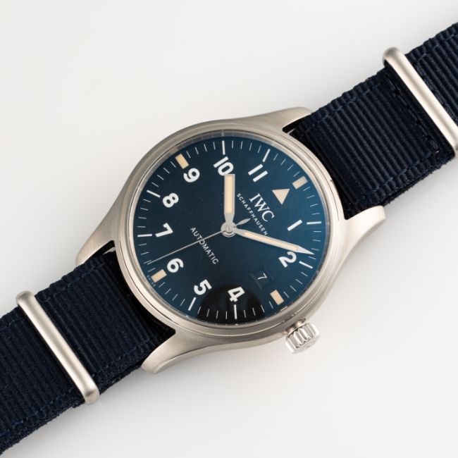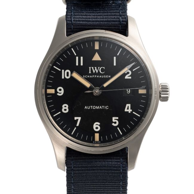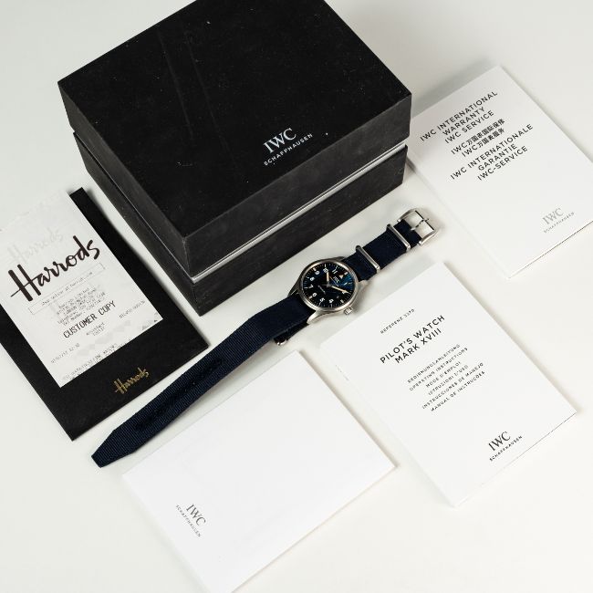 A GENTLEMAN'S SIZE STAINLESS STEEL IWC PILOTS MARK XVIII WRIST WATCH DATED 2017, REF. IW3270007 TRIBUTE TO MARK XI BRITISH MILITARY, LIMITED EDITION OF 1948 PIECES, ACCOMPANIED BY ITS ORIGINAL BOX, GUARANTEE CARD (ORIGINALLY PURCHASED FROM HARRODS), BOOKLETS & IWC SERVICE PAPERWORK FROM APRIL 2025Movement: Automatic, signed IWC, numbered.Case: Diameter approx. 40mm, screw back, signed IWC Edition Tribute to Mark XI One out of 1948, numbered, IWC crown.Strap: IWC blue textile NATO strap.  CONDITION REPORTDial: Original dial in excellent condition.Movement: Running & functioning at present, timekeeping and accuracy cannot be guaranteed.Case: In excellent condition, with some light scratches to the crystal coating.Strap/Bracelet: In excellent condition.