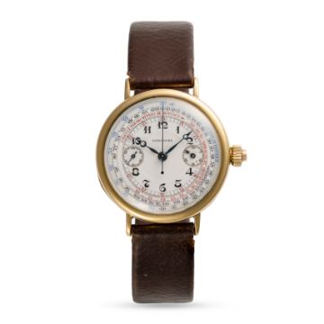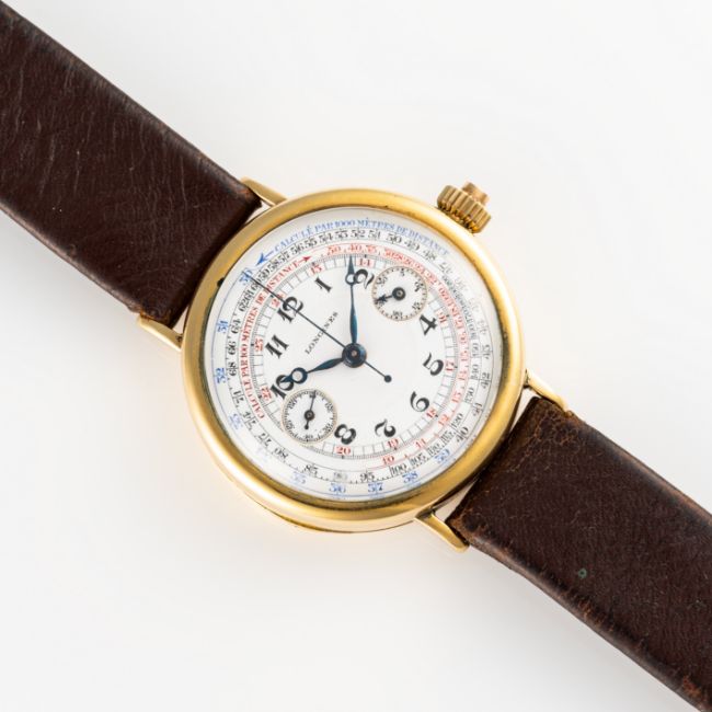 A RARE GENTLEMAN'S SIZE 18K SOLID GOLD LONGINES MONO PUSHER CHRONOGRAPH WRIST WATCH CIRCA 1925, WITH ORIGINAL ENAMEL DIAL & BREGUET HANDS Movement: Manual wind, cal. 13.33, signed Longines, numbered 4,4xx,xxx.Case: Diameter approx. 34mm, snap back with hinged cuvette, signed Longines, 7 Grand Prix Chronograph Computer, 18k Swiss hallmarks, matching numbers on case back and movement. Strap: Leather. CONDITION REPORTDial: Original dial in excellent condition, no damage.Movement: Running & functioning at present, timekeeping and accuracy cannot be guaranteed.Case: In very good condition, with some scratches and wear due to general use.Strap/Bracelet: In poor condition.
