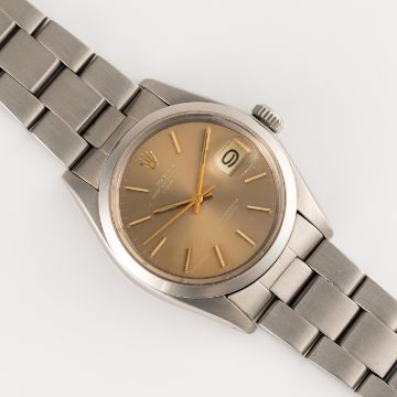 A GENTLEMAN'S SIZE STAINLESS STEEL ROLEX OYSTER PERPETUAL DATE WRIST WATCHCIRCA 1972, REF. 1500 WITH LIGHT BRONZE COLOUR SIGMA DIAL, ACCOMPANIED BY ORIGINAL ROLEX INNER BOX & GUARANTEE PAPERWORKMovement: 26J, automatic chronometer, cal. 1570, signed Montres Rolex S.A., numbered.Case: Diameter approx. 34mm, Oyster case, signed Montres Rolex S.A., serial no. 3,8xx,xxx, Rolex crown.Bracelet: Rolex Oyster bracelet, numbered 78350/557. CONDITION REPORTDial: Original dial in excellent condition.Movement: Running & functioning at present, timekeeping and accuracy cannot be guaranteed.Case: In very good condition, with some scratches and wear due to general use.Strap/Bracelet: In good condition, with some scratches and wear due to general use.