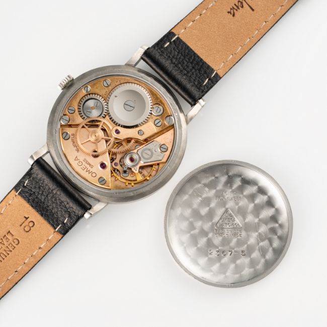 A GENTLEMAN'S LARGE SIZE STAINLESS STEEL OMEGA RG CHRONOMETRE CENTRE SECONDS WRIST WATCH CIRCA 1940s, REF. 2367-5 WITH REFINISHED DIAL, ACCOMPANIED BY A COPY OF AN INDEPENDENT SERVICE RECIPT FROM JAN 2025Movement: 16J, manual wind chronometer, cal. 30T2 SC Rg, signed Omega, numbered 10,5xx,xxx.Case: Diameter approx. 35.5mm, snap back, signed Omega Watch Co. Omega crown.Strap: Leather. CONDITION REPORTDial: Refinished dial in excellent condition.Movement: Running & functioning at present, timekeeping and accuracy cannot be guaranteed.Case: In excellent condition, with some light wear due to general use.Strap/Bracelet: In good condition.