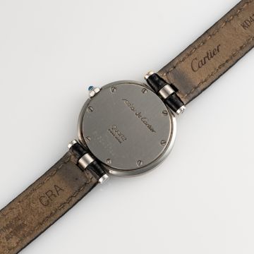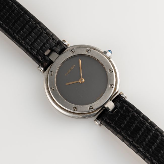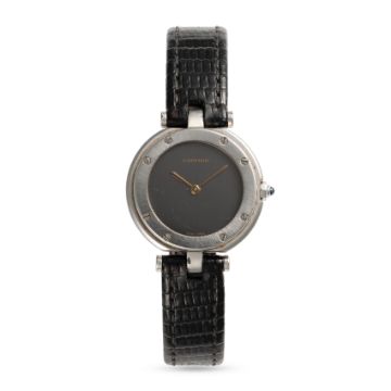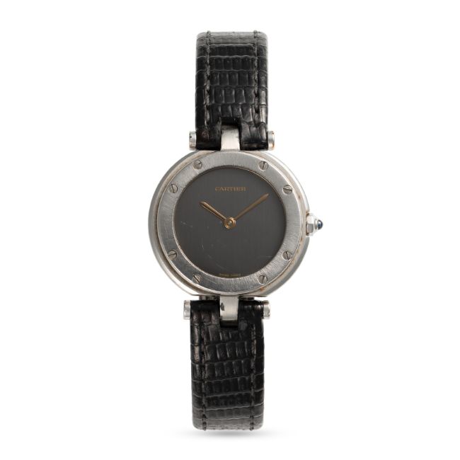 A LADY'S STAINLESS STEEL CARTIER SANTOS VENDOME WRIST WATCHCIRCA 1980s, REF. 8192 WITH GREY "GHOST" DIAL Movement: Quartz, signed Cartier. Case: Diameter approx. 27mm, signed Cartier, numbered, sapphire crown. Strap: Cartier strap & pin buckle. CONDITION REPORTDial: Original dial in excellent condition.Movement: Running & functioning at present, timekeeping and accuracy cannot be guaranteed.Case: In very good condition, with some light scratches and wear due to general use.Strap/Bracelet: In good condition, showing some wear.