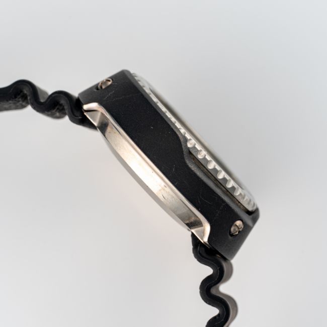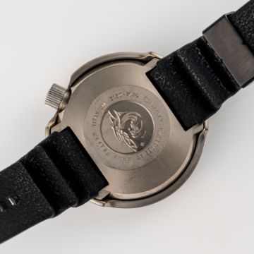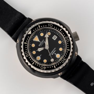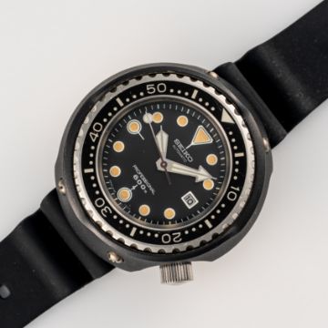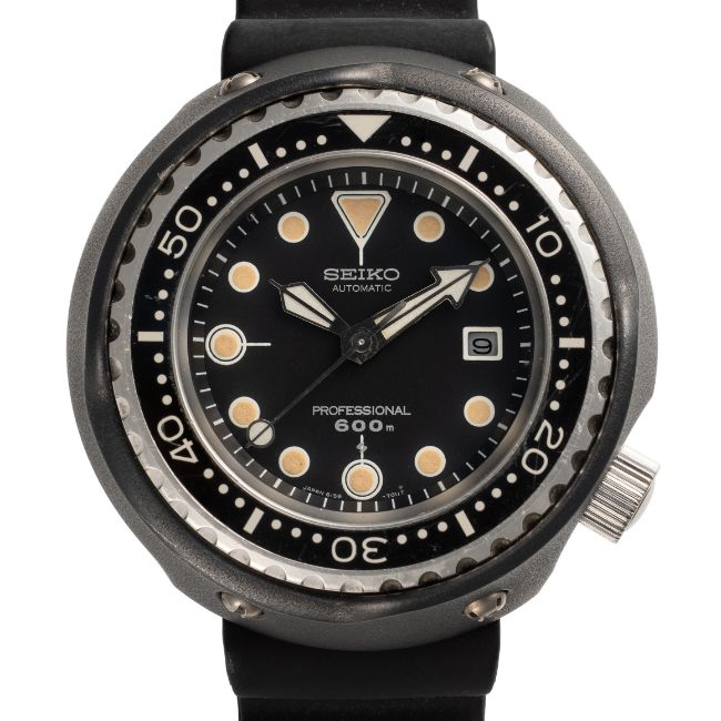 A RARE GENTLEMAN'S SIZE TITANIUM & CERAMIC COATED SEIKO "GRANDFATHER TUNA" PROFESSIONAL 600M AUTOMATIC DIVERS WRIST WATCHCIRCA 1976, REF. 6159-7010Movement: 25J, automatic, quick-set date, signed Seiko. Case: Diameter approx. 51mm , signed Seiko, wave emblem embossed on case back, numbered, 60 minute rotating bakelite bezel, screw-down crown.Strap: Rubber Seiko strap.  CONDITION REPORTDial: Original dial in excellent condition. Movement: Running & functioning at present, timekeeping and accuracy cannot be guaranteed. Case: In very good condition, with some light scratches due to general use. Strap/Bracelet: In excellent condition.