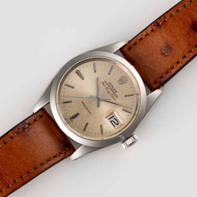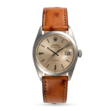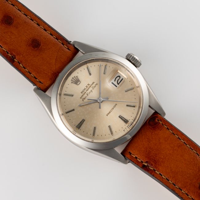 A GENTLEMAN'S SIZE STAINLESS STEEL ROLEX OYSTER PERPETUAL AIR KING DATE PRECISION WRIST WATCHCIRCA 1967, REF. 5700 ACCOMPANIED BY A ROLEX BOXMovement: 26J, automatic, cal. 1520, signed Rolex Geneve.Case: Diameter approx. 35mm, Oyster case, signed Montres Rolex S.A., numbered 1,54x,xxx (some numbers worn from bracelet wear), dated I.67, Rolex crown.Strap: Leather.  CONDITION REPORTDial: Original dial in fair condition, showing some signs of age & patina. Movement: Running & functioning at present, timekeeping and accuracy cannot be guaranteed. Case: In good condition, with some scratches and wear due to general use. Strap/Bracelet: In very good condition.