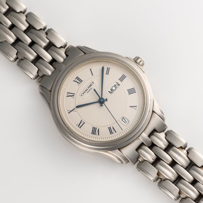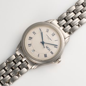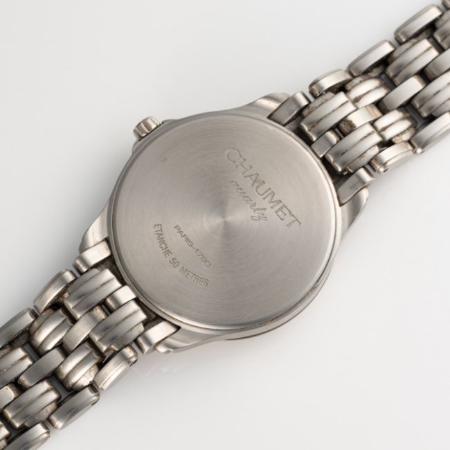 A MIDSIZE STAINLESS STEEL CHAUMET AQUILA BRACELET WATCH CIRCA 2000, WITH GUILLOCHE DIAL, ACCOMPANIED BY THE ORIGINAL BOX & OPEN GUARANTEE BOOKLETMovement: Quartz, signed Chaumet.Case: Diameter approx. 35mm, signed Chaumet Paris 1780, Chaumet crown.Bracelet: Original stainless steel Chaumet bracelet.  CONDITION REPORTDial: Original dial in excellent condition. Movement: Running & functioning at present, timekeeping and accuracy cannot be guaranteed. Case: In very good condition, with some light scratches due to general use. Strap/Bracelet: In very good condition with some wear and surface scratches. Box is in fair condition
