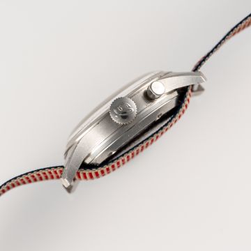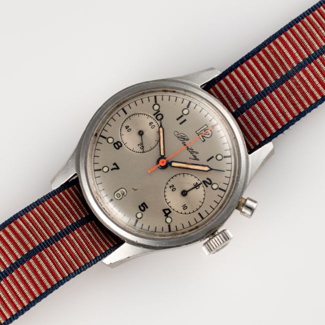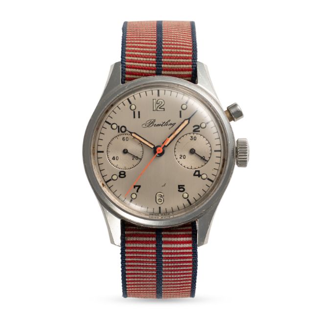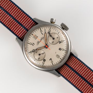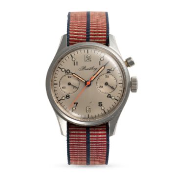 A GENTLEMAN'S SIZE STAINLESS STEEL ROYAL CANADIAN AIR FORCE (RCAF) BREITLING SINGLE BUTTON MILITARY CHRONOGRAPH WRIST WATCH DATED 1969Movement: 17J, manual wind, Venus cal. 236, signed Breitling Watch Ltd.Case: Diameter approx. 36mm, screw back, signed Breitling Watch Ltd,  military issue markings D.N.D SN NS 2293/69/ Stock No 6645/21/802/1267 MFG Breitling, Breitling crown. Strap: Textile.  CONDITION REPORTDial: Refinished dial in good condition. Movement: Running & functioning at present, timekeeping and accuracy cannot be guaranteed. Case: In good condition, with some scratches and wear due to use. Strap/Bracelet: In fair condition.