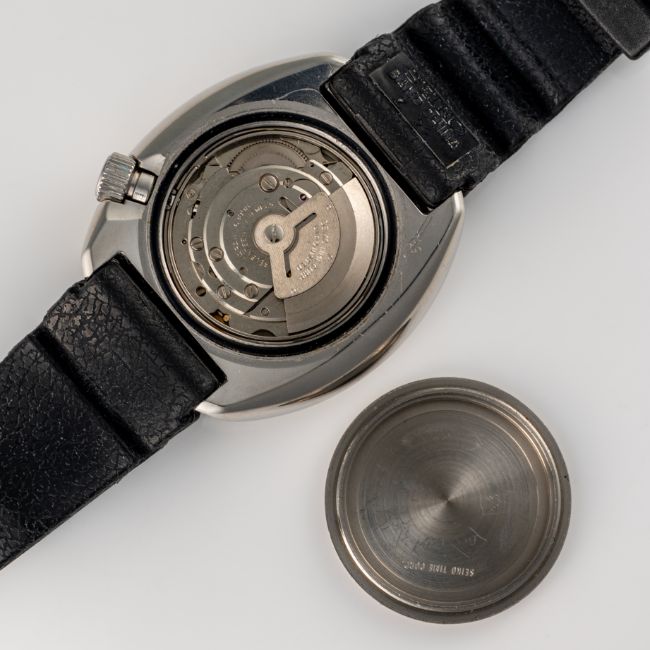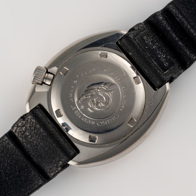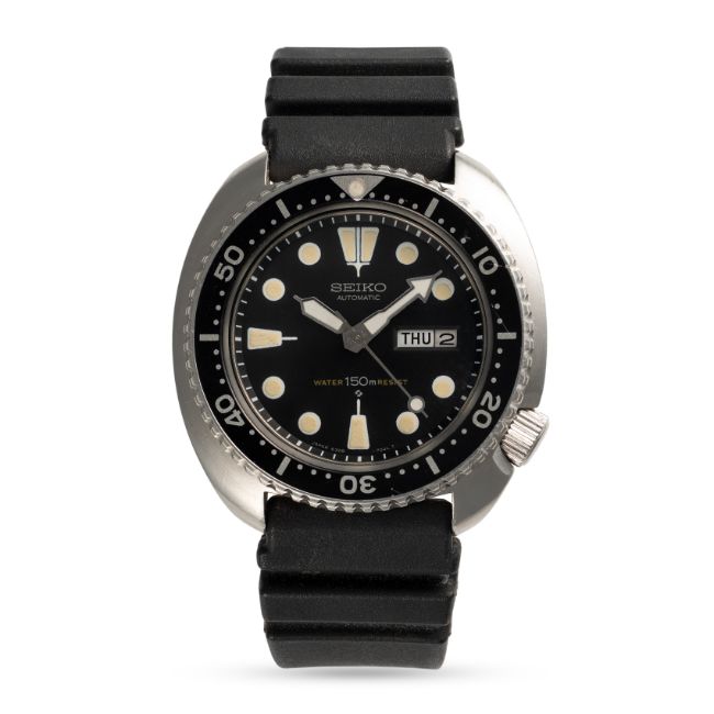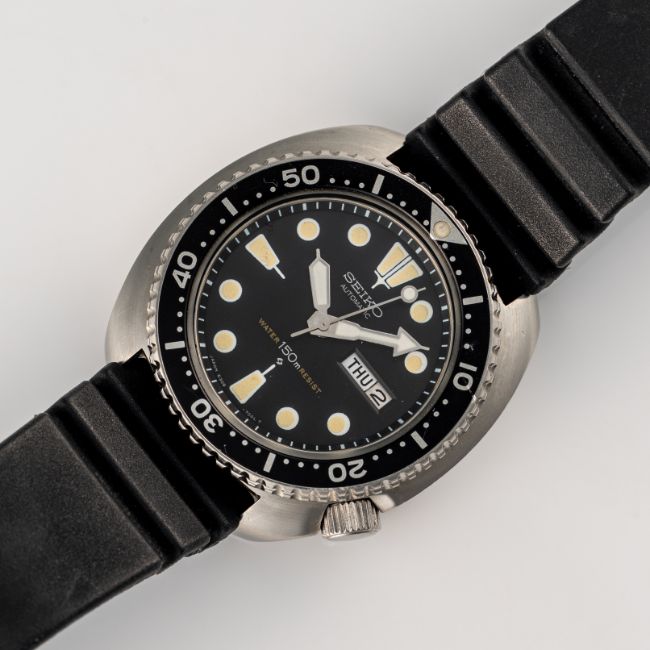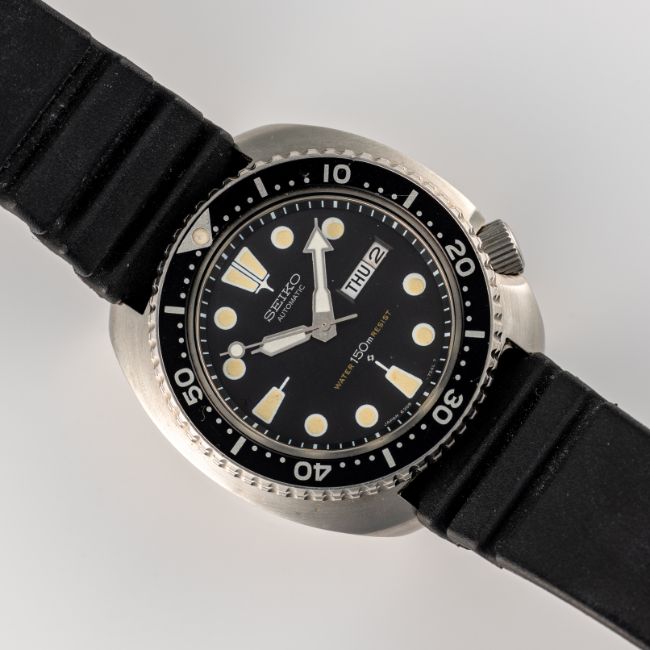A GENTLEMAN'S SIZE STAINLESS STEEL AUTOMATIC SEIKO "TURTLE" 150M RESIST DIVERS WRIST WATCHCIRCA 1976, REF. 6309-7049Movement: 17J, automatic, quick-set date, signed Seiko Time Corp. Case: Diameter approx. 44mm , signed Seiko Time Corp, wave emblem embossed on case back, numbered, 60 minute rotating bezel, screw-down crown.Strap: Rubber Seiko strap. CONDITION REPORTDial: Original dial in excellent condition.Movement: Running & functioning at present, timekeeping and accuracy cannot be guaranteed.Case: In very good condition, with some light surface scratches due to general use.Strap/Bracelet: In good condition.