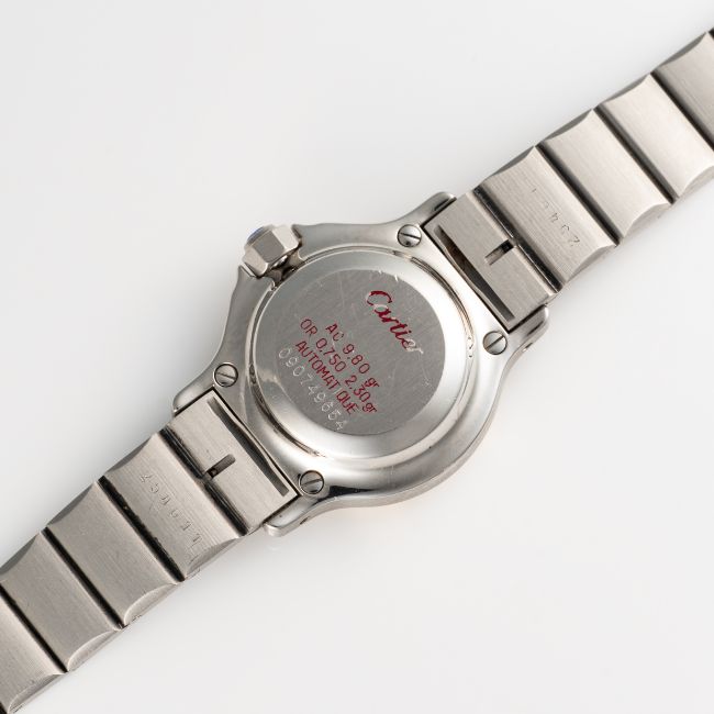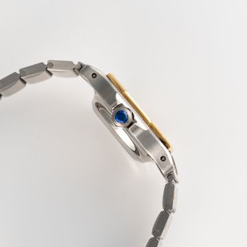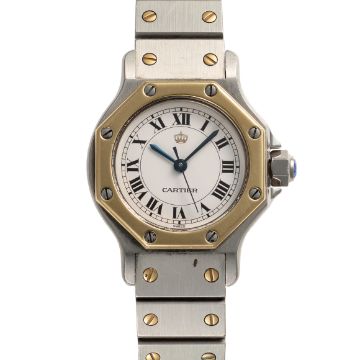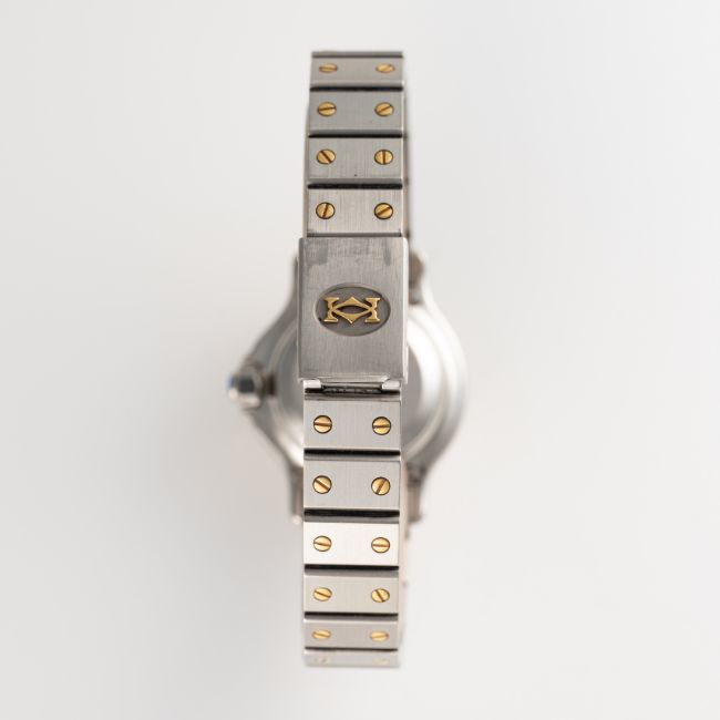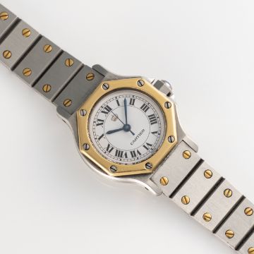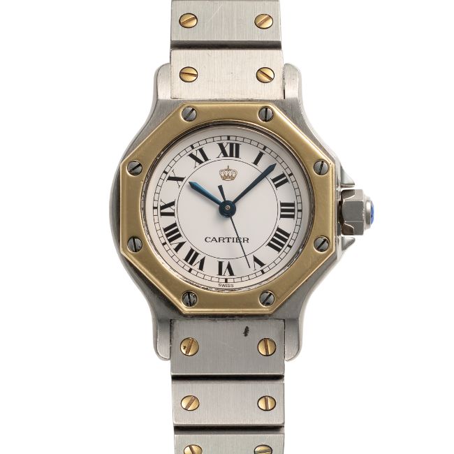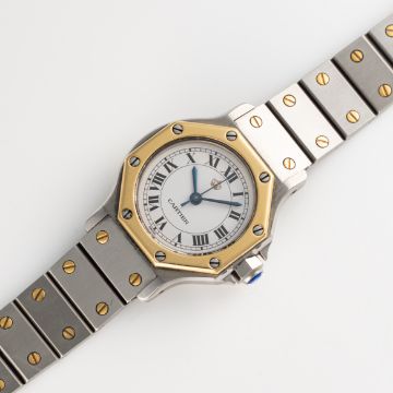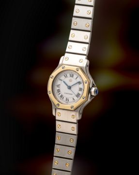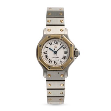 A LADY'S RARE STEEL & GOLD CARTIER SANTOS OCTAGON BRACELET WATCHCIRCA 1980s, REF. 09074 COMMISSIONED BY THE JORDANIAN ROYAL FAMILY, THE DIAL FEATURING THE ROYAL JORDANIAN CROWN Movement: Automatic, signed Cartier. Case: Width approx. 24.5mm, signed Cartier Paris, numbered, sapphire crown. Bracelet: Original steel & 18k gold Cartier Santos bracelet.  CONDITION REPORTDial: Original dial in excellent condition. Movement: Running & functioning at present, timekeeping and accuracy cannot be guaranteed. Case: In very good condition, with some light scratches due to general use. Strap/Bracelet: In very good condition, with light scratches due to general use.