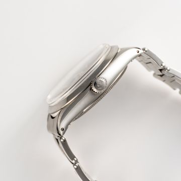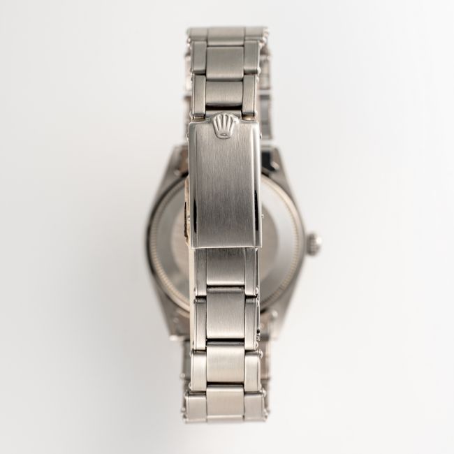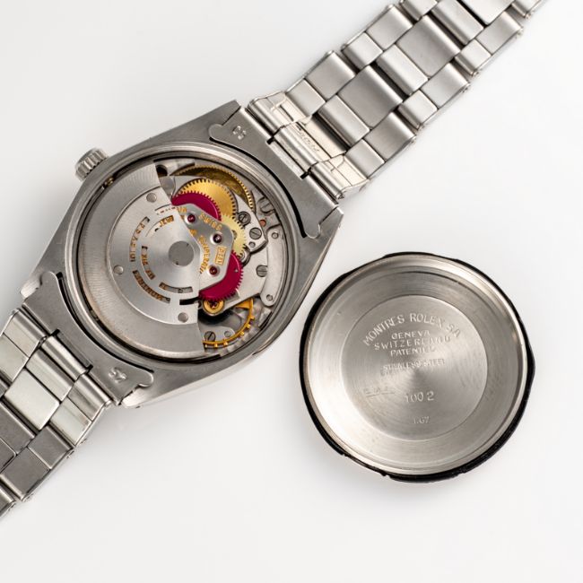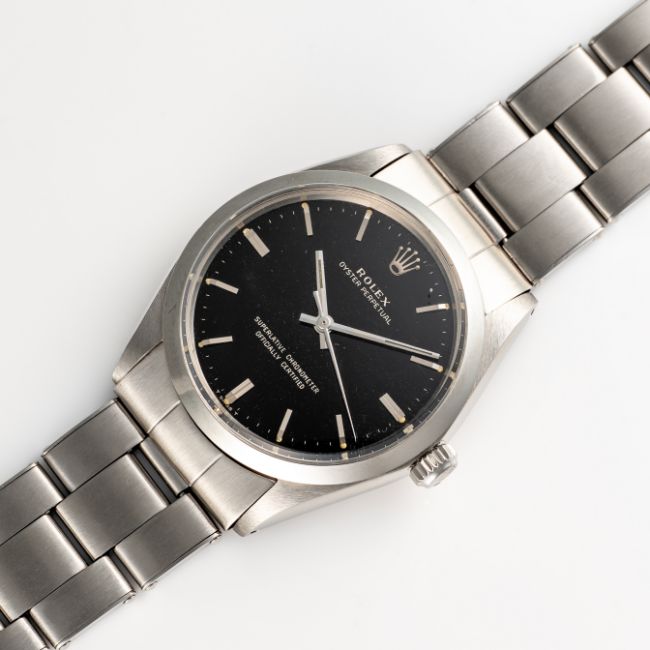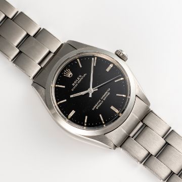 A RARE GENTLEMAN'S SIZE STAINLESS STEEL ROLEX OYSTER PERPETUAL CHRONOMETER BRACELET WATCHCIRCA 1967, REF. 1002 WITH GLOSS BLACK GILT DIALMovement: 26J, automatic chronometer, cal. 1570, signed Montres Rolex S.A. Geneva, numbered.Case: Diameter approx. 34mm, Oyster case, signed Montres Rolex S.A., dated l.67, numbered 1,55x.xxx, Rolex crown.Bracelet: Rolex Oyster riveted bracelet, dated. 2.67, numbered 7205/60.  CONDITION REPORTDial: Original dial in excellent condition. Movement: Running & functioning at present, timekeeping and accuracy cannot be guaranteed. Case: In very good condition, with some surface scratches due to general use. Strap/Bracelet: In very good condition, with some surface scratches and wear due to general use.