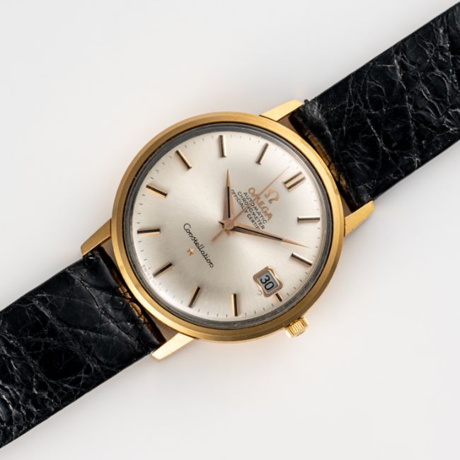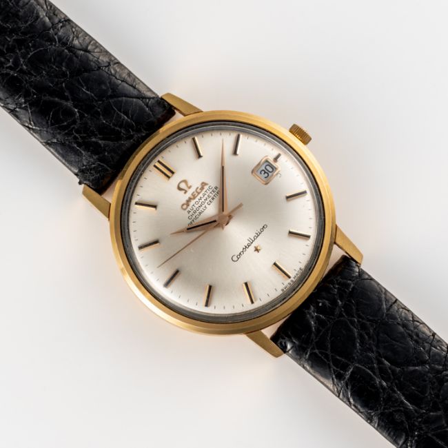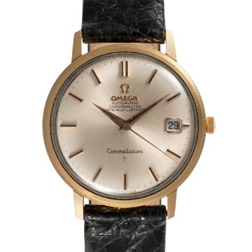 A GENTLEMAN'S SIZE 18K SOLID ROSE GOLD OMEGA CONSTELLATION CHRONOMETER DATE WRIST WATCH CIRCA 1968, WITH SILVER DIALMovement: 24J, automatic chronometer, cal. 564, signed Omega Watch Co., numbered 26,xxx,xxx.Case: Diameter approx. 35mm, snap back, gold Constellation badge embossed on case back, unsigned case marked with French eagle head 18/0.750, original crown.Strap: Leather.  CONDITION REPORTDial: Original dial in excellent condition. Movement: Running & functioning at present, timekeeping and accuracy cannot be guaranteed. Case: In excellent condition, with some surface scratches due to general use. Strap/Bracelet: In good condition.