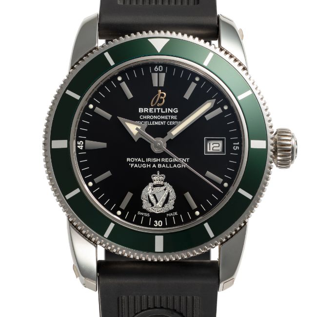 A RARE GENTLEMAN'S SIZE STAINLESS STEEL BREITLING SUPEROCEAN HERITAGE 42 BRITISH MILITARY AUTOMATIC WRIST WATCH DATED 2016, REF. A173212A/BF10 ONE OF 25 PIECES PRODUCED FOR THE ROYAL IRISH REGIMENT 'FAUGH A BALLAGH' ACCOMPANIED BY THE ORIGINAL BOX, DIGITAL WARRANTY CARD, CHRONOMETER CERTIFICATE & LIMITED EDITION CERTIFICATEMovement: Automatic chronometer, signed Breitling, numbered.Case: Diameter approx. 42mm, screw back, signed Breitling, Royal Irish Regiment logo embossed, numbered, rotating bezel with green insert, original crown.Strap: Original Breitling rubber strap & folding clasp.  CONDITION REPORTDial: Original dial in excellent condition. Movement: Running & functioning at present, timekeeping and accuracy cannot be guaranteed. Case: In excellent condition, with some light scratches due to occasional use. Strap/Bracelet: In excellent condition.