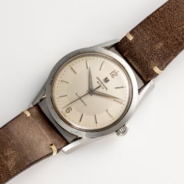 A GENTLEMAN'S SIZE STAINLESS STEEL UNIVERSAL GENEVE AUTOMATIC WRIST WATCHCIRCA 1950s, REF. 20219-1 WITH TWO TONE SILVER DIALMovement: 17J, "bumper" automatic, cal. 138SS, signed Universal Geneve.Case: Diameter approx. 34mm, screw back, Universal Geneve logo embossed on case back, numbered, UG crown. Strap: Leather.  CONDITION REPORTDial: Original dial in excellent condition. Movement: Running & functioning at present, timekeeping and accuracy cannot be guaranteed. Case: In very good condition, with some scratches due to general use. Strap/Bracelet: In good condition.