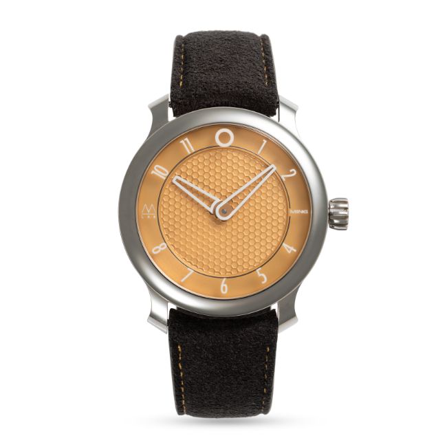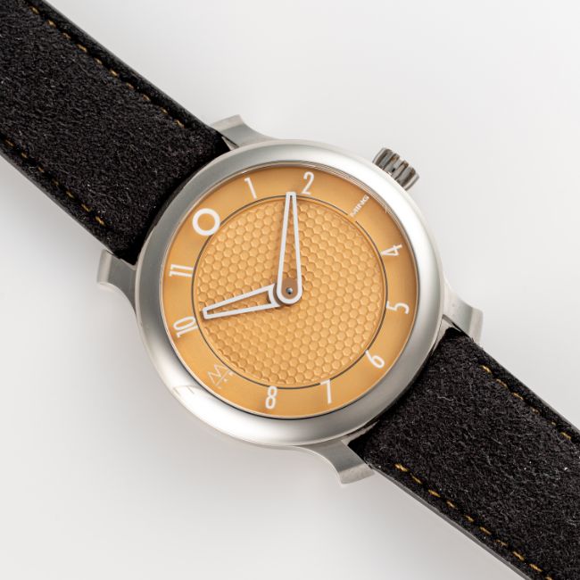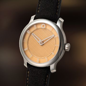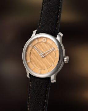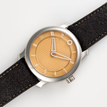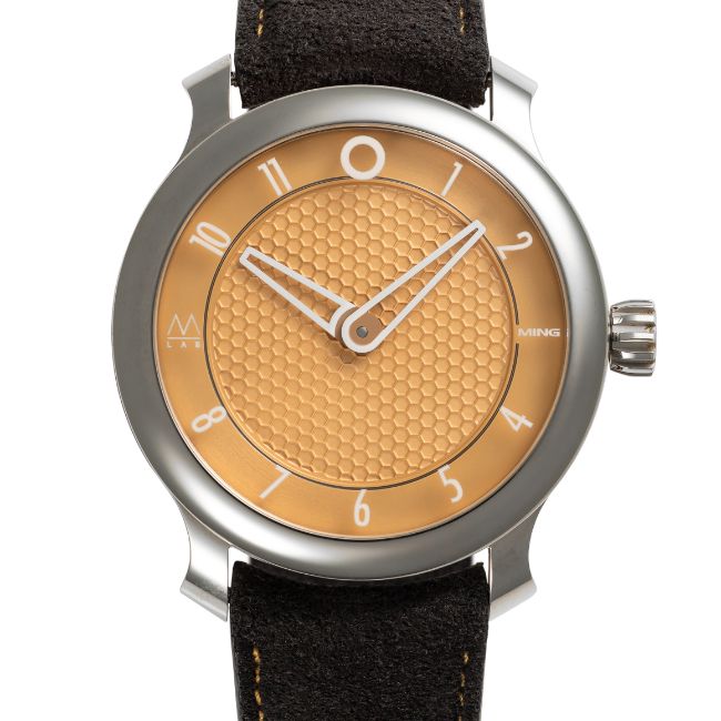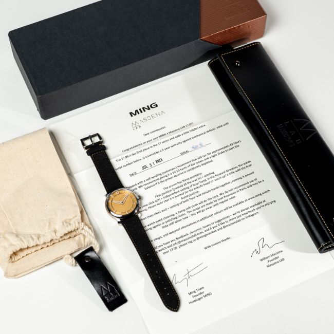 A RARE GENTLEMAN'S SIZE STAINLESS STEEL MING X MASSENA LAB WRIST WATCHDATED 2023, REF. 17.09 "HONEY" ONE OF ONLY 50 PIECES, ACCOMPANIED BY THE ORIGINAL BOX & PAPERWORK Movement: Automatic, Ming cal. 330.M1, signed Ming. Case: Diameter approx. 38mm, two piece case, signed Ming, numbered, original crown.Strap: Original Jean Rousseau for Ming leather strap & pin buckle. CONDITION REPORTDial: Original dial in excellent condition. Movement: Running & functioning at present, timekeeping and accuracy cannot be guaranteed. Case: Unworn. Strap/Bracelet: Unworn.
