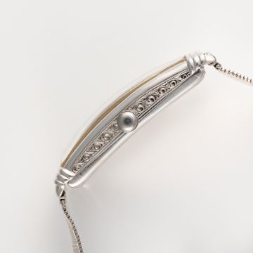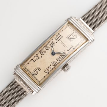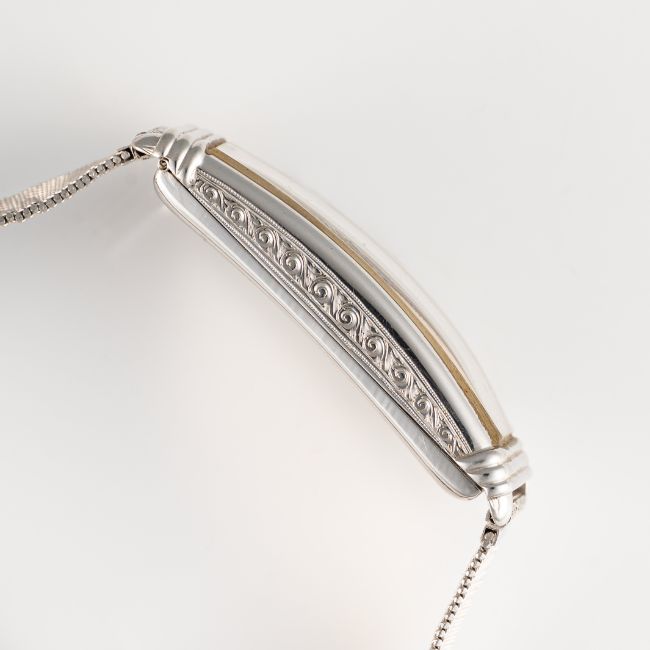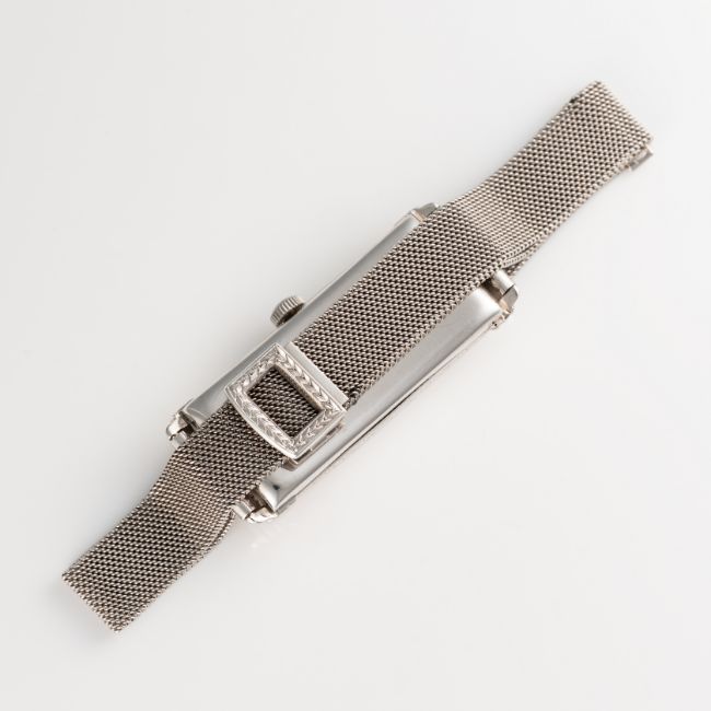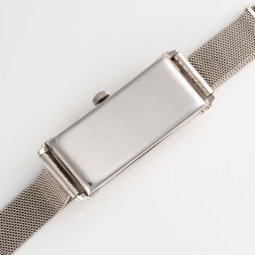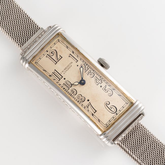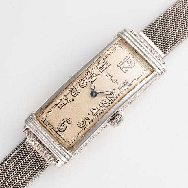 A FINE & RARE LARGE RECTANGULAR 18K WHITE GOLD MOVADO CURVEX BRACELET WATCHCIRCA 1936, REF. 6035 RETAILED BY J.W.BENSONMovement: 15J, manual wind, signed Movado, 4 Adjustments.Case: Approx. 43mm (inc. lugs) by 16.5mm, 'clock in hand' Movado makers mark, 18k London import mark letter (D), numbered. Bracelet: Platinum bracelet. CONDITION REPORTDial: Original dial in good condition, showing some signs of age. Movement: Running & functioning at present, timekeeping and accuracy cannot be guaranteed. Case: In very good condition, with some light scratches and wear due to general use. Strap/Bracelet: In very good condition.