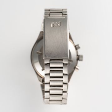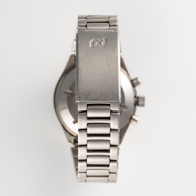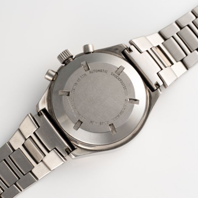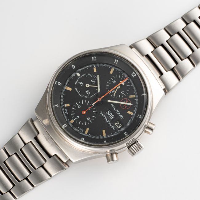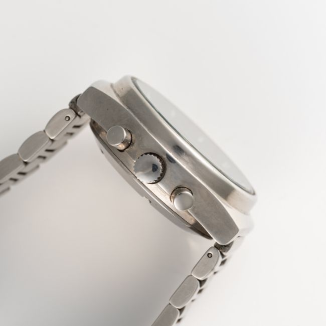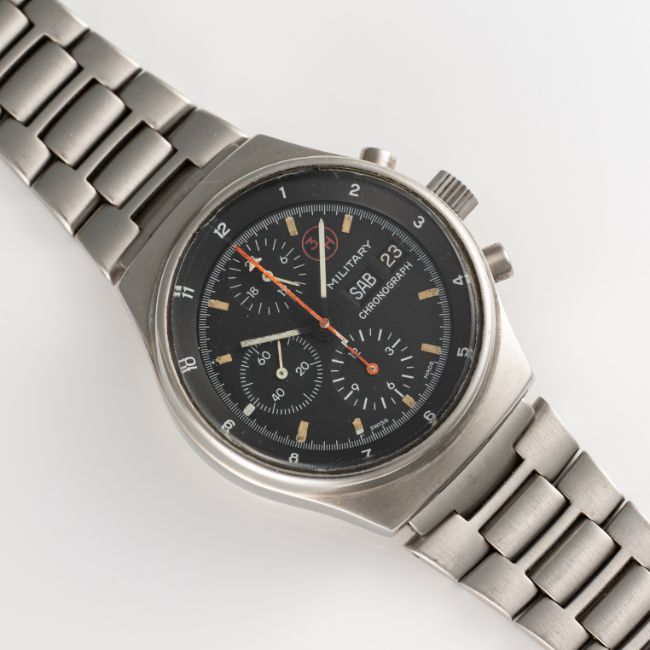 A RARE GENTLEMAN'S STAINLESS STEEL ORFINA PORSCHE DESIGN MILITARY CHRONOGRAPH BRACELET WATCH CIRCA 1980, REF.7177 ISSUED TO THE VENEZUELAN ARMED FORCES Movement: 17J, automatic, Lemania cal. 5100, signed Lemania Watch Ltd, numbered.Case: Diameter approx. 41mm, screw back, signed Orfina Watch Ltd, EJERCITO DE VENEZUELA 00208, original pushers & screw-down crown, numbered.Bracelet: Original Porsche Design stainless steel bracelet.  CONDITION REPORTDial: Original dial in good condition, showing some signs of age. Movement: Running & functioning at present, timekeeping and accuracy cannot be guaranteed. Case: In good condition, with some wear due to use. Strap/Bracelet: In good condition, with signs of use.