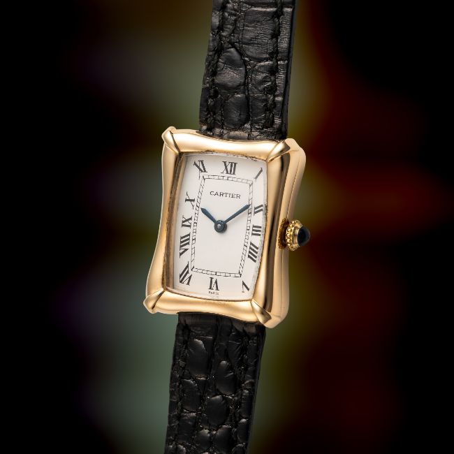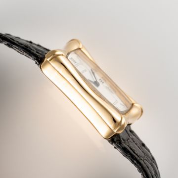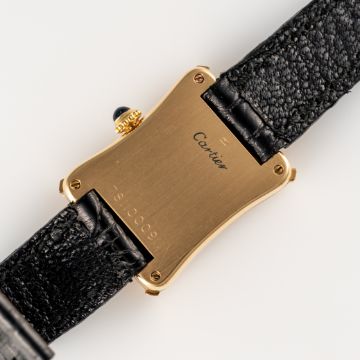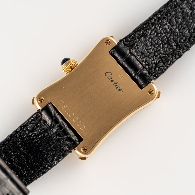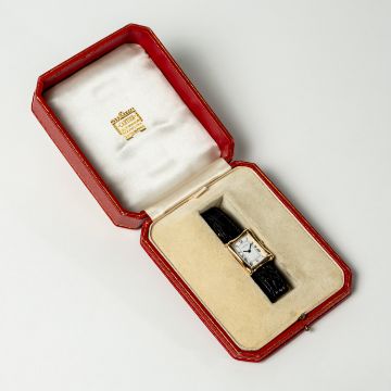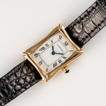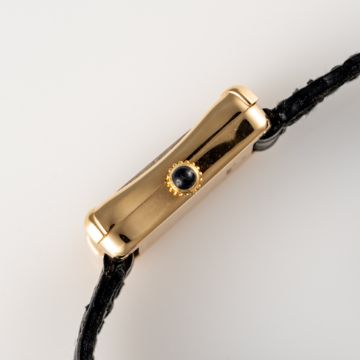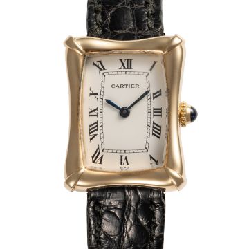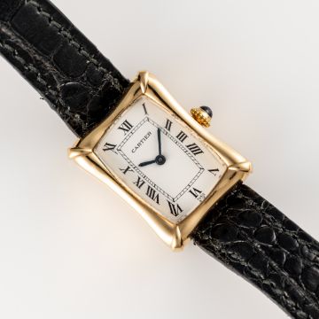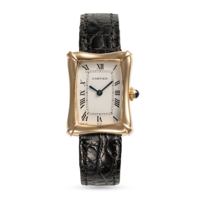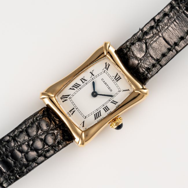 A VERY RARE LADY'S 18K SOLID GOLD CARTIER PARIS BAMBOO COUSSIN WRIST WATCHCIRCA 1970s, REF. 78110 ACCOMPANIED BY A CARTIER LONDON WATCH BOX Movement: 17J, manual wind, cal. 2512-1, signed Cartier.Case: Measures approx. 26.7mm by 20.7mm, 18k hallmarks, numbered, sapphire crown. Strap: Leather strap with Cartier 18k solid gold deployant clasp.   CONDITION REPORTDial: Original dial in very good condition, showing a light patina. Movement: Running & functioning at present, timekeeping and accuracy cannot be guaranteed. Case: In very good condition, with some light scratches due to general use. Strap/Bracelet: In fair condition, deployment clasp in very good condition. Box: Missing inner watch holder.