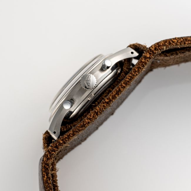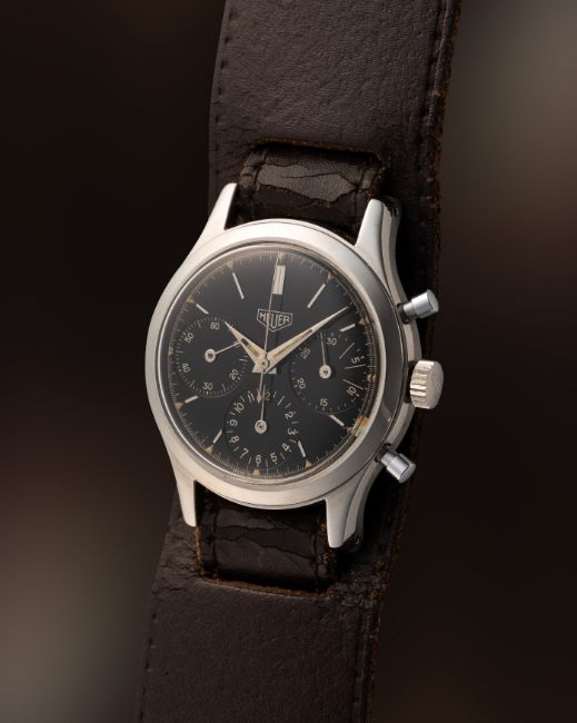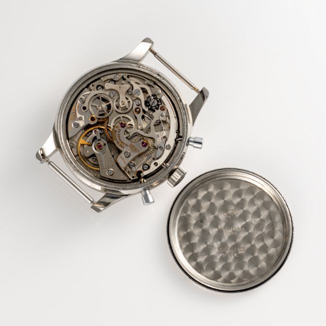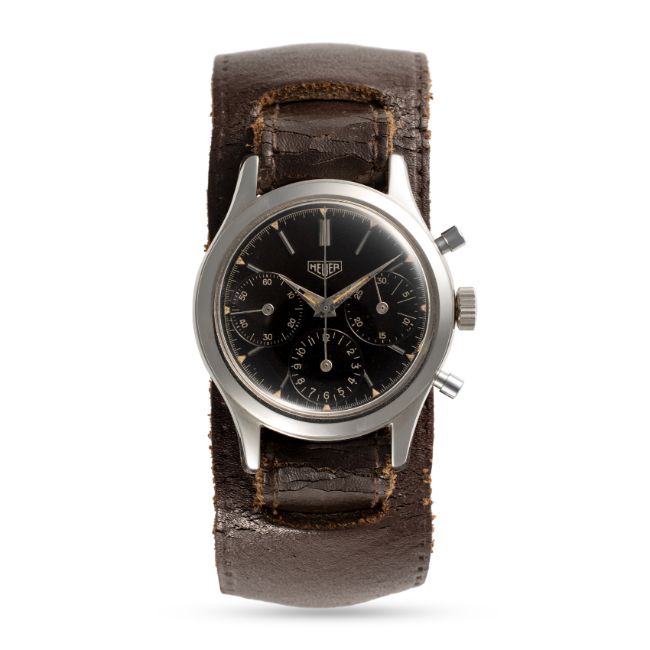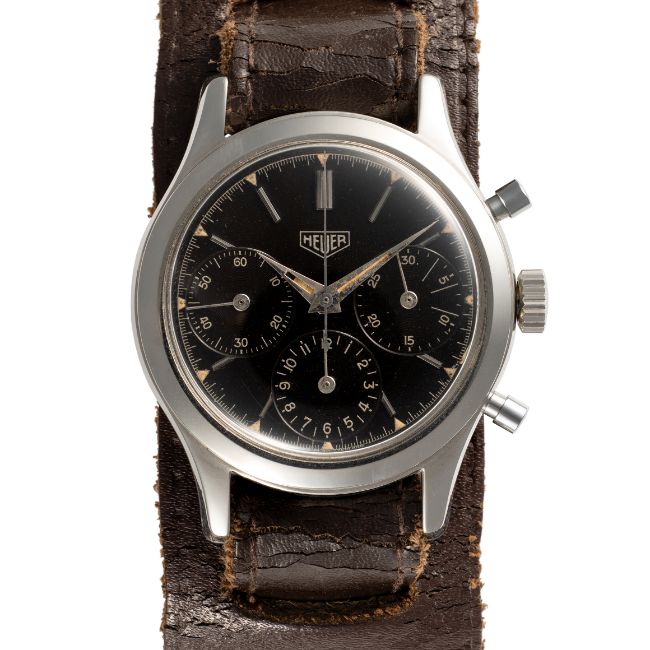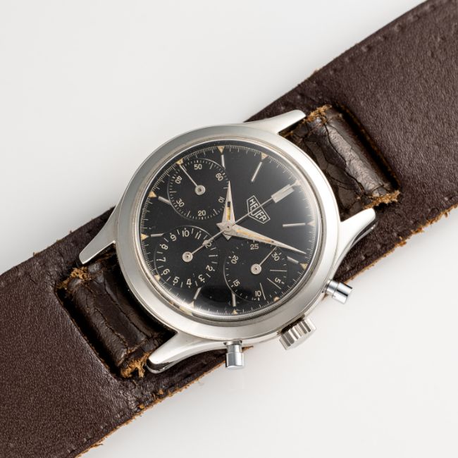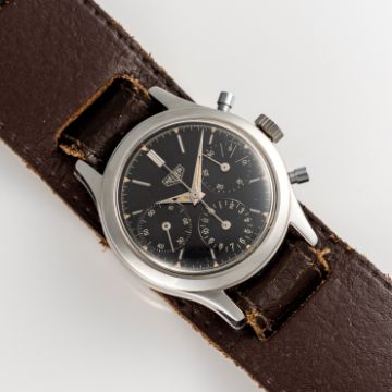 A RARE GENTLEMAN'S SIZE STAINLESS STEEL HEUER "PRE CARRERA" CHRONOGRAPH WRIST WATCH CIRCA 1950s, REF. 2444N WITH GLOSS BLACK DIAL & DAUPHINE HANDS Movement: 17J, manual wind, Valjoux cal. 72, signed Ed Heuer & Co SA, numbered.Case: Diameter approx. 36mm, screw back, signed Heuer, Ed Heuer & Co.Strap: Leather.