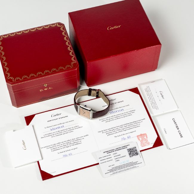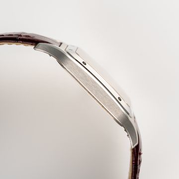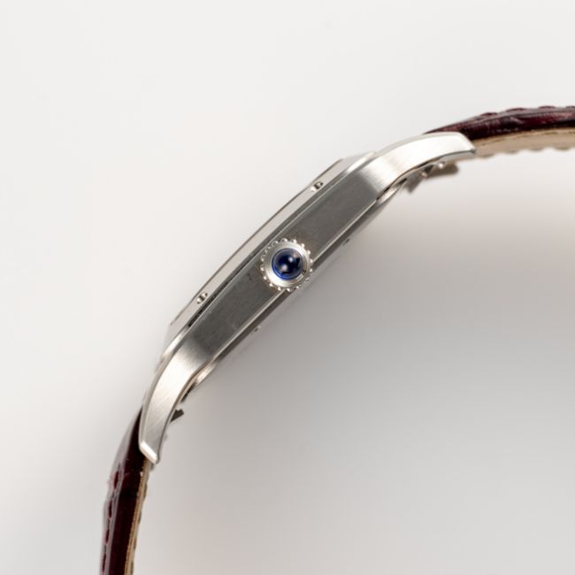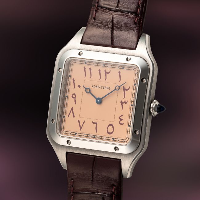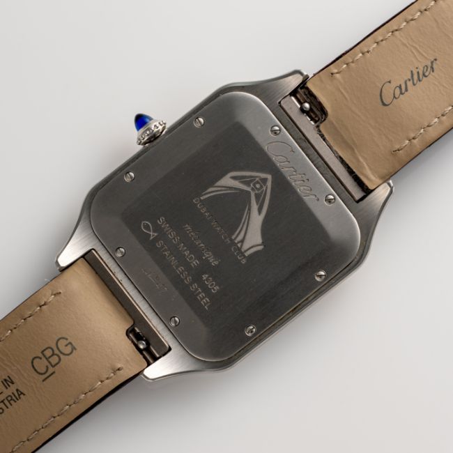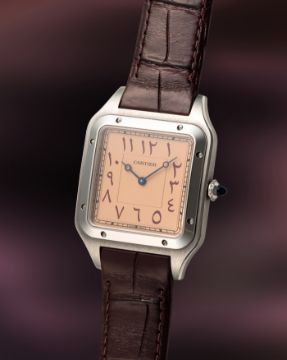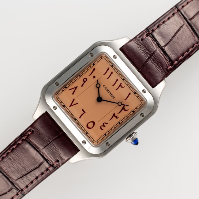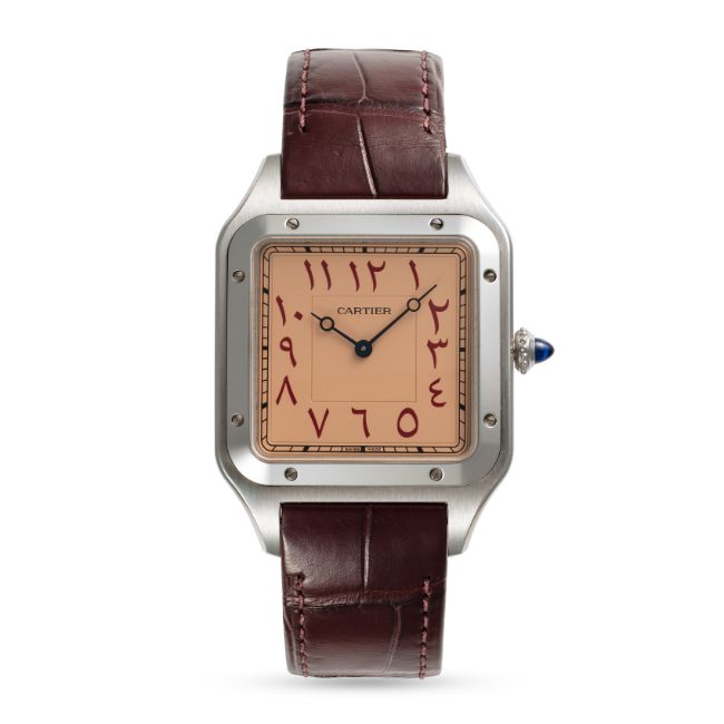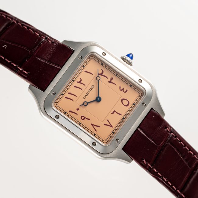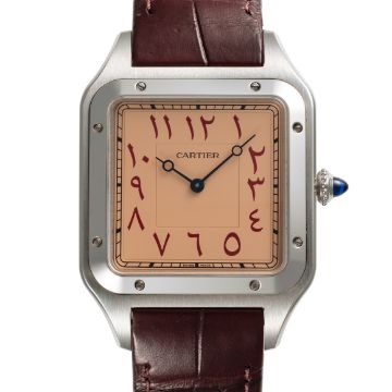 A RARE GENTLEMAN'S SIZE STAINLESS STEEL CARTIER SANTOS DUMONT EXTRA LARGE MECANIQUE WRIST WATCHDATED 2021, REF. WSSA0049 LIMITED EDITION OF 50 PIECES MADE FOR THE DUBAI WATCH CLUB WITH SALMON-PINK DIAL & EASTERN ARABIC NUMERALS, ACCOMPANIED BY THE ORIGINAL BOX, WARRANTY CARD & CERTIFICATE OF ORIGINMovement: Manual wind, signed Cartier.Case: Width approx. 35mm, signed Cartier, Dubai Watch Club logo embossed, numbered, sapphire crown. Strap: Original Cartier leather strap & pin buckle.  CONDITION REPORTDial: Original dial in excellent condition. Movement: Running & functioning at present, timekeeping and accuracy cannot be guaranteed. Case: In very good condition, with some light scratches due to general use. Strap/Bracelet: In very good condition.