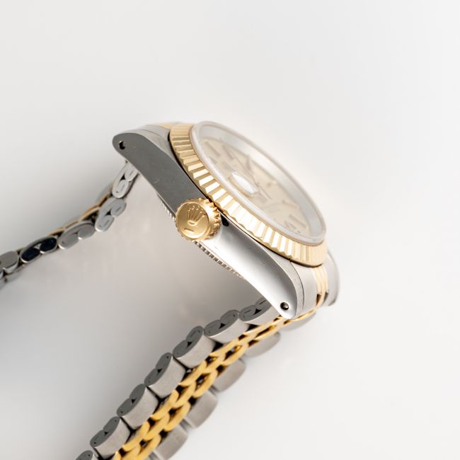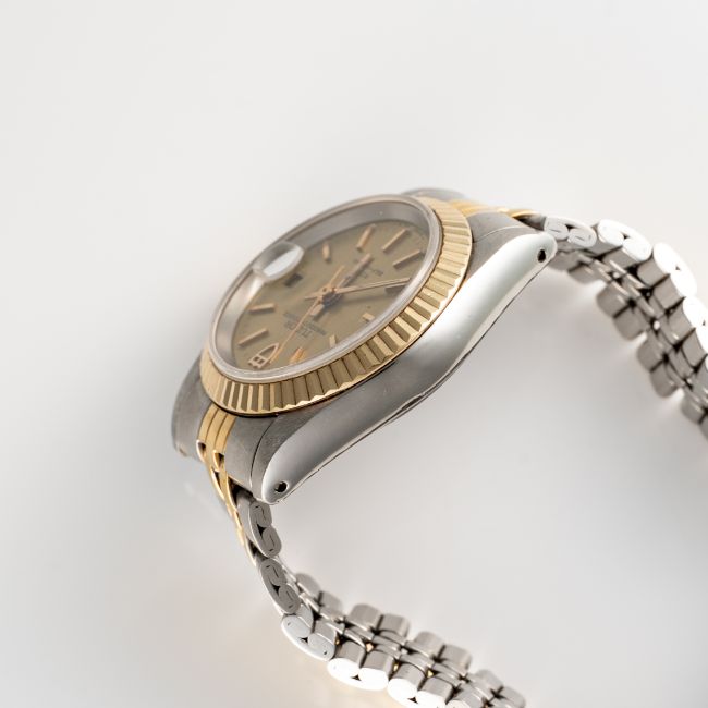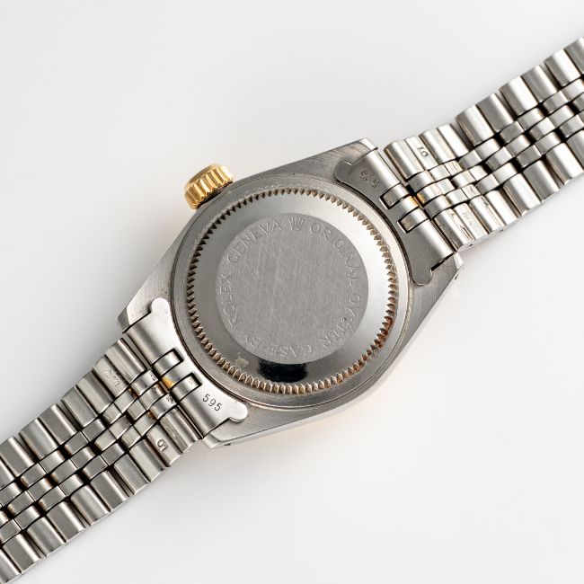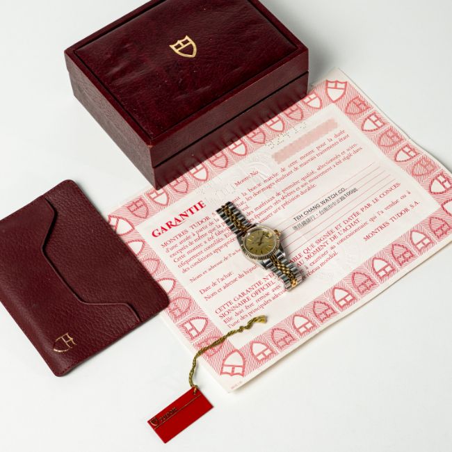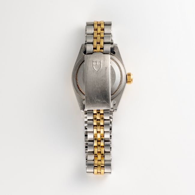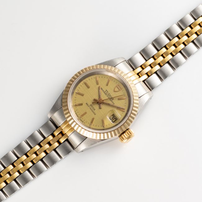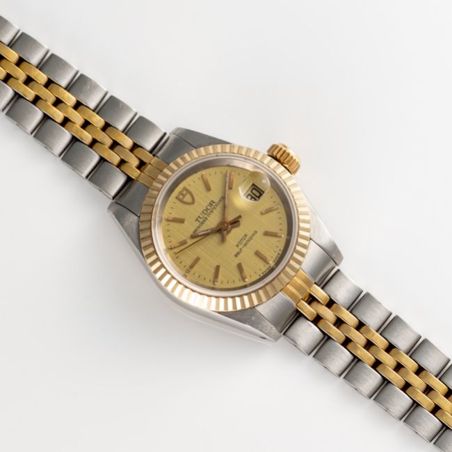 A LADY'S STEEL & GOLD ROLEX TUDOR PRINCESS OYSTERDATE BRACELET WATCHCIRCA 1977, REF. 92413 ACCOMPANIED BY THE ORIGINAL BOX, TAG, WALLET & GUARANTEE PAPERWORKMovement: Automatic, signed Tudor.Case: Diameter approx. 25mm, Oyster case, signed Montres Tudor S.A., numbered, fluted bezel, sapphire crystal, Rolex crown.Bracelet: Original Tudor bracelet, numbered 392/01//595  CONDITION REPORTDial: Original dial in excellent condition. Movement: Running & functioning at present, timekeeping and accuracy cannot be guaranteed. Case: In excellent condition, with some light scratches due to general use. Strap/Bracelet: In very good condition with some wear due to general use.