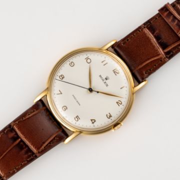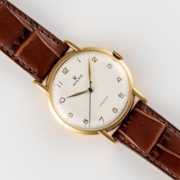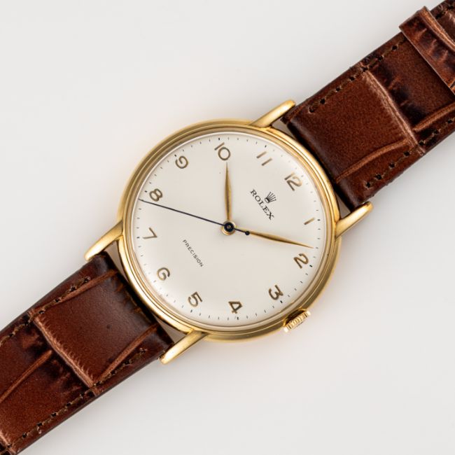 A GENTLEMAN'S LARGE SIZE 18K SOLID GOLD ROLEX PRECISION WRIST WATCHCIRCA 1950s, REF. 4222 Movement: 17J, manual wind, signed Rolex Precision Superbalance.Case: Diameter approx. 34.6mm, two piece case, signed Rolex, numbered, 18k hallmarks, Rolex crown. Strap: Leather. CONDITION REPORTDial: Refinished dial in excellent condition.Movement: Running & functioning at present, timekeeping and accuracy cannot be guaranteed.Case: In very good condition, serial number not visible.Strap/Bracelet: In very good condition.