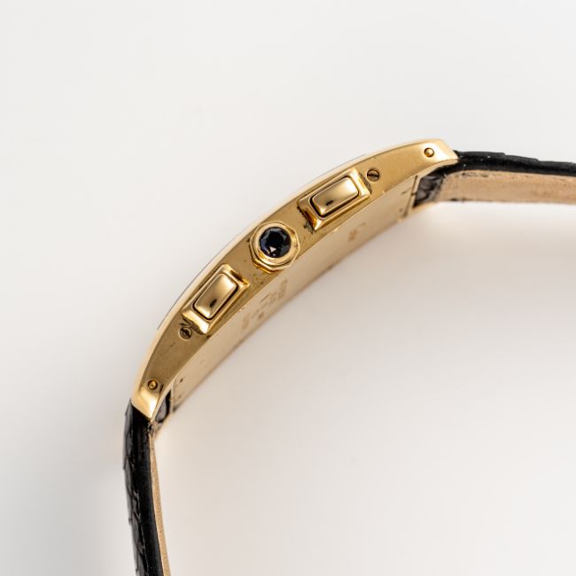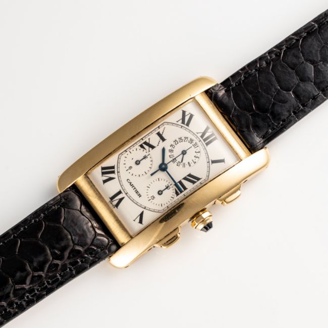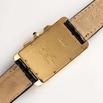 A GENTLEMAN'S SIZE 18K SOLID YELLOW GOLD CARTIER TANK AMERICAINE CHRONOGRAPH WRIST WATCH CIRCA 1990s, REF. 1730Movement: Quartz, signed Cartier.Case: Measures approx. 45mm by 28mm, signed Cartier, numbered, 18k hallmarks, sapphire crown. Strap: Leather.  CONDITION REPORTDial: Original dial in excellent condition. Movement: Running & functioning at present, timekeeping and accuracy cannot be guaranteed. Case: In very good condition, with some surface scratches due to general use. Strap/Bracelet: In excellent condition.