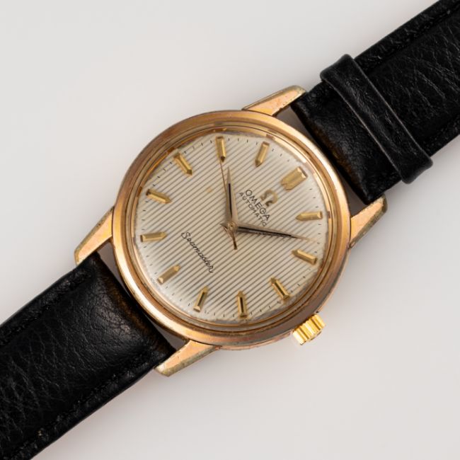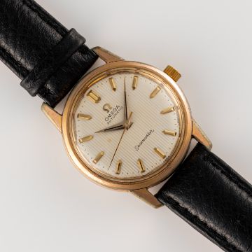 A GENTLEMAN'S SIZE GOLD FILLED OMEGA SEAMASTER AUTOMATIC WRIST WATCH CIRCA 1960, REF. BK14704 2 SC WITH PINSTRIPE DIALMovement: 20J, automatic, cal. 591, signed Omega Watch Co, numbered 17,xxx,xxx. Case: Diameter approx. 33.5mm, screw back, signed Omega Watch Co, Omega crown, Omega plexiglass.Strap: Leather. CONDITION REPORTDial: Original dial in very good condition, showing some signs of age around the edge.Movement: Running & functioning at present, timekeeping and accuracy cannot be guaranteed.Case: In fair condition, gold plating worn.Strap/Bracelet: In very good condition.