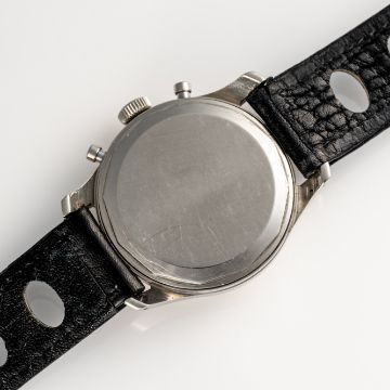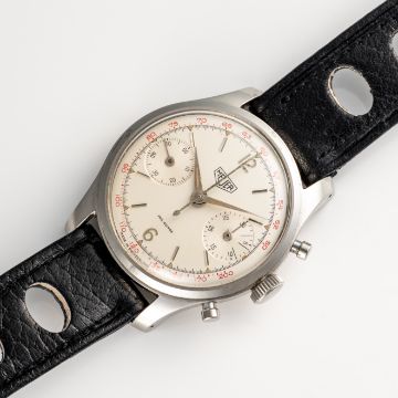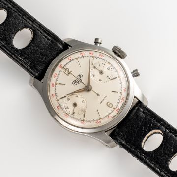 A RARE GENTLEMAN'S SIZE STAINLESS STEEL HEUER "PRE CARRERA" CHRONOGRAPH WRIST WATCHCIRCA 1950s, REF. 404T WITH FAB SUISSE & RED TACHYMETER SCALE DIALMovement: 17J, manual wind, Valjoux cal. 23, signed Ed Heuer & Co Switzerland SA, numbered.Case: Diameter approx. 34mm, screw back, signed Heuer, Ed Heuer & Co.Strap: Leather.  CONDITION REPORTDial: Original dial in very good condition, showing some small signs of age. Movement: Running & functioning at present, timekeeping and accuracy cannot be guaranteed. Case: In very good condition, with some light scratches and wear due to general use. Strap/Bracelet: In good condition.