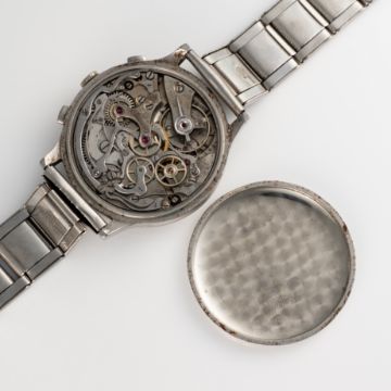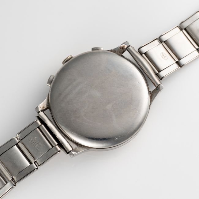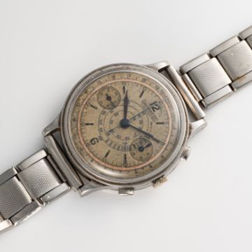 A GENTLEMAN'S LARGE SIZE STAINLESS STEEL EBERHARD & CO EXTRA FORT CHRONOGRAPH BRACELET WATCH CIRCA 1940s, REF. 26355   Movement: Manual, signed Eberhard & Co, hacking seconds is activated by sliding the bottom pusher.Case: Diameter approx. 40mm, signed Eberhard & Co.Bracelet: Stainless Steel HaRo stretchy bracelet. CONDITION REPORTDial: Original dial in fair condition, showing signs of age.Movement: Running when the chronograph is not active but stops when the chronograph is activated.Case: In very good condition, with some wear due to general use.Strap/Bracelet: In fair condition.