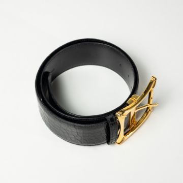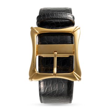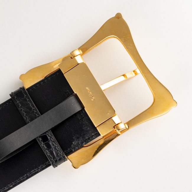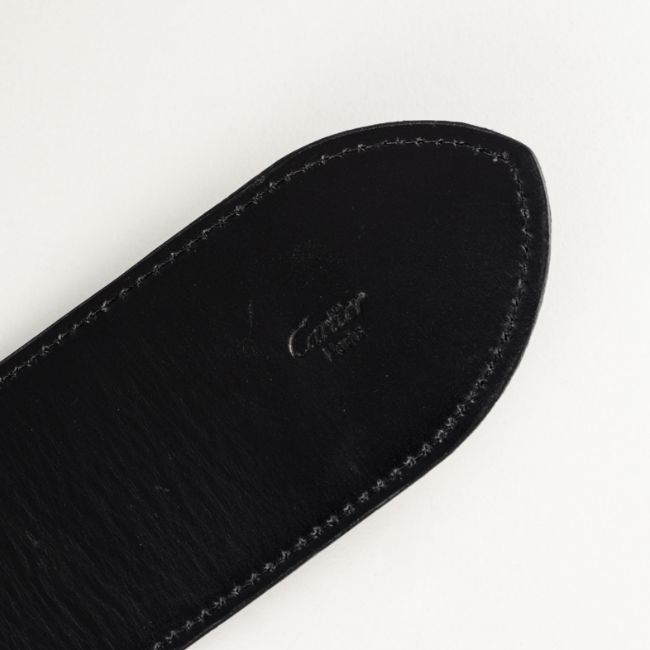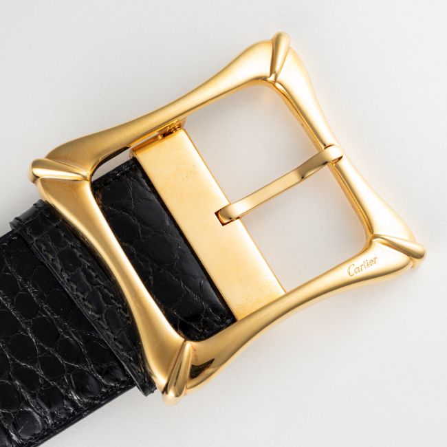 A RARE LARGE CARTIER BAMBOO COUSSIN BELT BUCKLE & LEATHER BELTCIRCA 1970s, SIGNED CARTIER MADE IN FRANCE Gold plated, buckle measures approx. 105cm by 50cm. CONDITION REPORTIn excellent condition.
