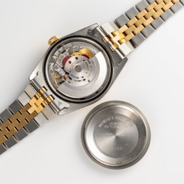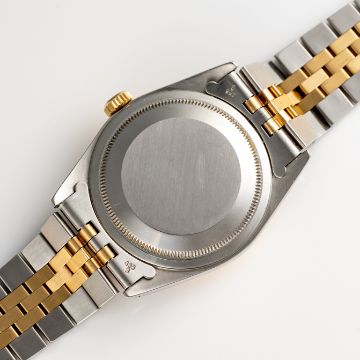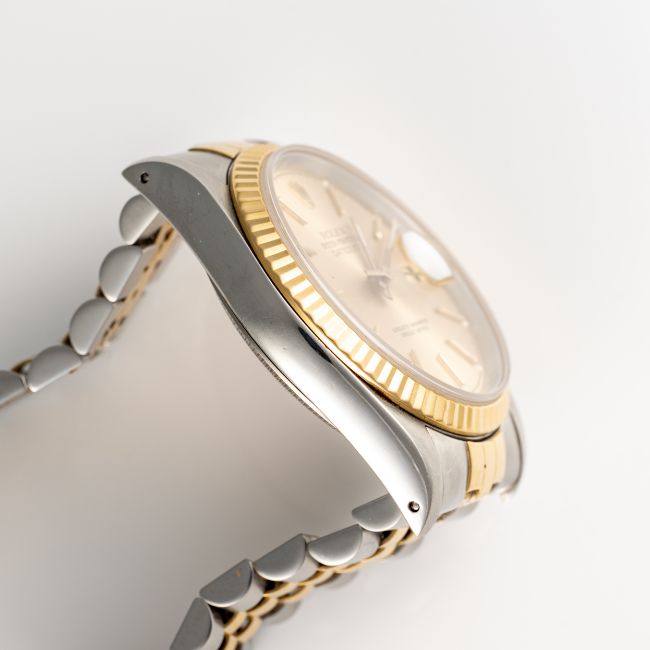 A GENTLEMAN'S SIZE STEEL & GOLD ROLEX OYSTER PERPETUAL DATEJUST BRACELET WATCHCIRCA 1989, REF. 16233 WITH CHAMPAGNE DIALMovement: 31J, automatic chronometer, cal. 3135, signed Montres Rolex S.A., numbered.Case: Diameter approx. 36mm, Oyster case, signed Montres Rolex S.A., L serial no., solid gold fluted bezel, sapphire crystal, Rolex crown.Bracelet: Original Rolex steel & 18k solid gold Jubilee bracelet, numbered 62523H18/04/455B.  CONDITION REPORTDial: Original dial in excellent condition. Movement: Running & functioning at present, timekeeping and accuracy cannot be guaranteed. Case: In very good condition, with some light scratches & wear due to general use. Strap/Bracelet: In very good condition, with some light scratches & wear.