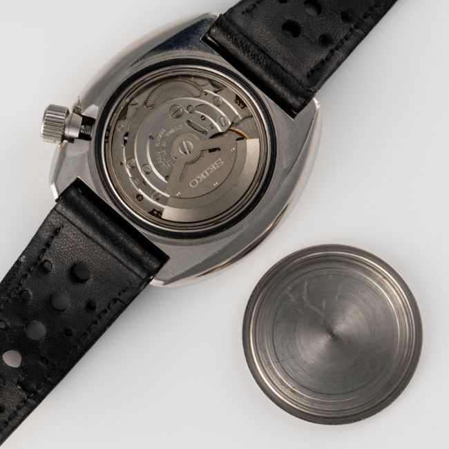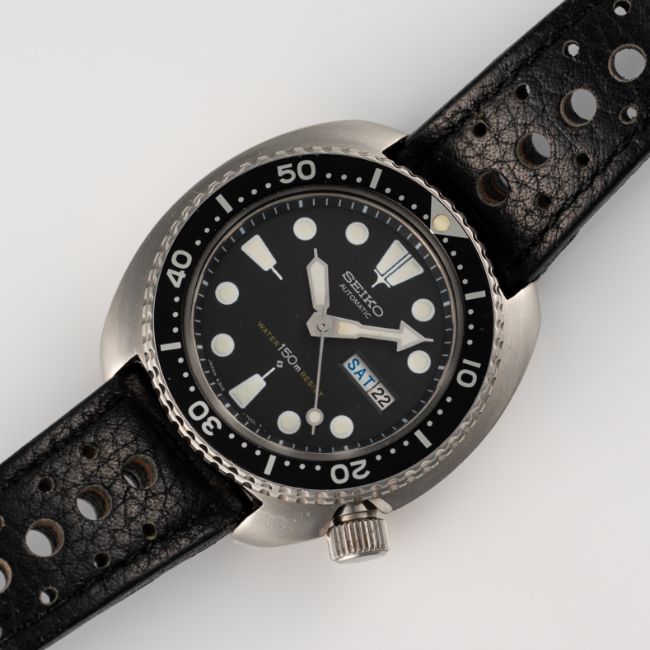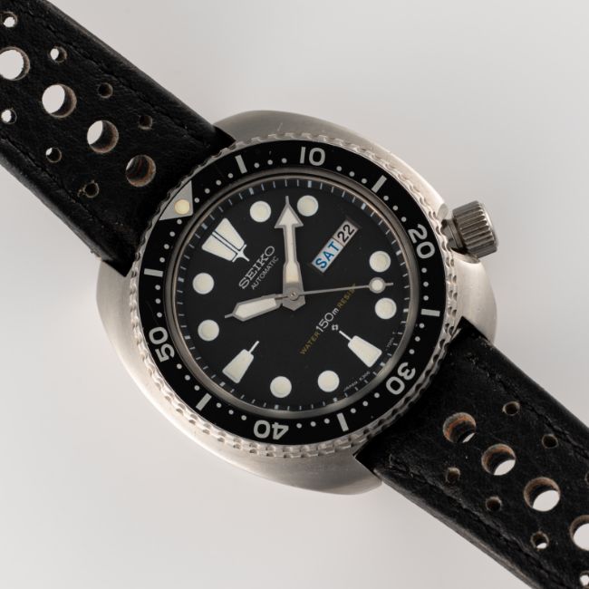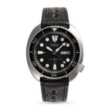 A GENTLEMAN'S SIZE STAINLESS STEEL AUTOMATIC SEIKO "TURTLE" 150M RESIST DIVERS WRIST WATCHCIRCA 1979, REF. 6306-7001 WITH "SUWA" SYMBOL DATE DISCMovement: 21J, automatic, quick-set date, signed Seiko.. Case: Diameter approx. 44mm , signed Seiko, wave emblem embossed on case back, numbered, 60 minute rotating bezel, screw-down crown.Strap: Leather. CONDITION REPORTDial: Original dial in excellent condition.Movement: Running & functioning at present, timekeeping and accuracy cannot be guaranteed.Case: In very good condition, with some light surface scratches due to general use.Strap/Bracelet: In good condition.