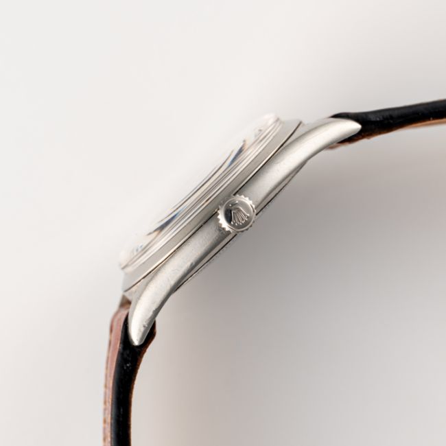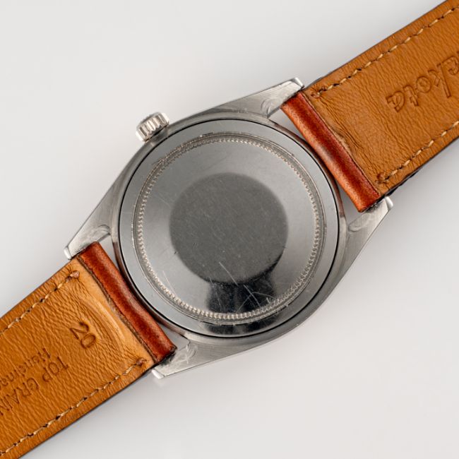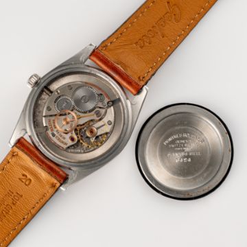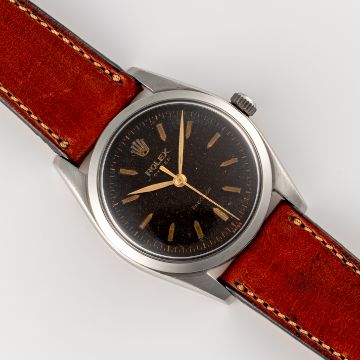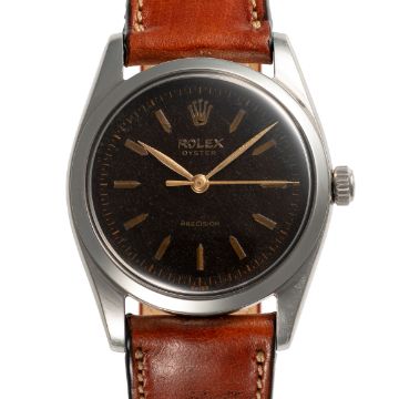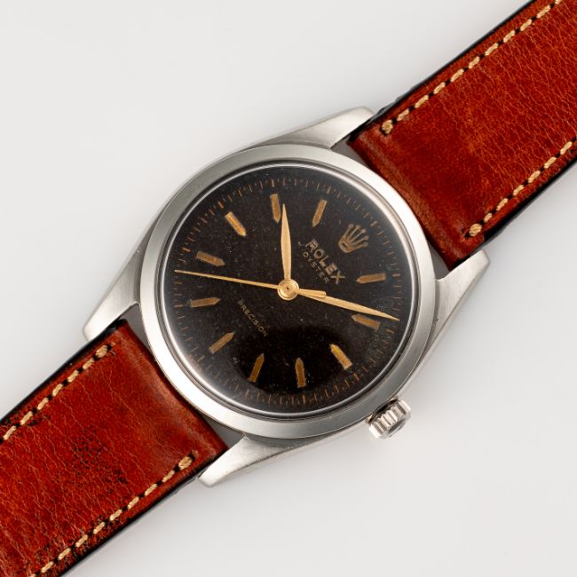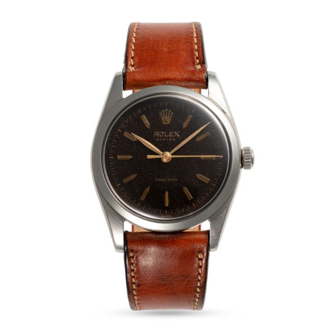A RARE GENTLEMAN'S LARGE SIZE STAINLESS STEEL ROLEX OYSTER PRECISION WRIST WATCHCIRCA 1956, REF. 6424 WITH "TROPICAL" BLACK DIAL, INDEPENDENT WATCHMAKER SERVICE RECEIPT FROM DECEMBER 2024Movement: 17J, manual wind, cal. 1210, signed Montres Rolex S.A, numbered.Case: Diameter approx. 36mm, Oyster case, signed Montres Rolex S.A., numbered, Rolex crown.Strap. Leather. CONDITION REPORTDial: Original dial in good condition. The dial has turned a brown colour and dial lacquer has crazed.Movement: Running & functioning at present, timekeeping and accuracy cannot be guaranteed.Case: In very good condition, with some scratches and wear due to general use.Strap/Bracelet: In excellent condition.