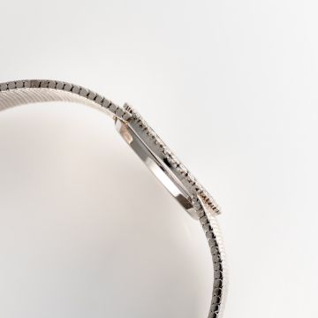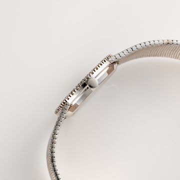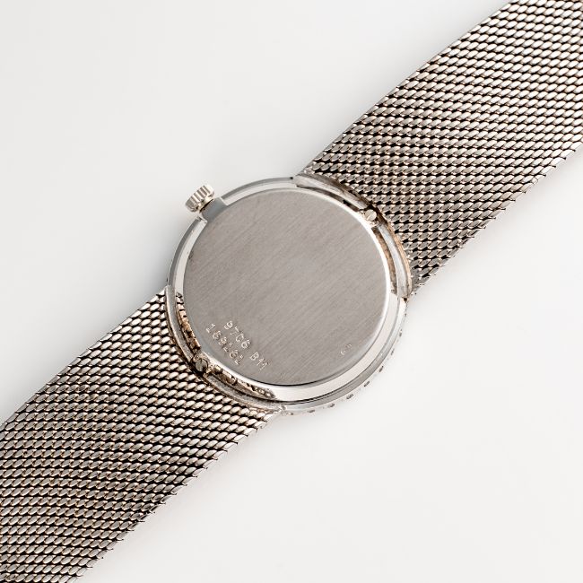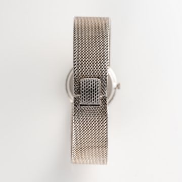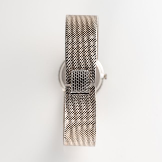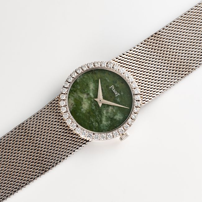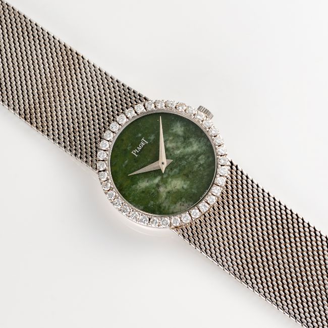 A LADY'S FINE 18K SOLID WHITE GOLD & DIAMOND PIAGET BRACELET WATCHCIRCA 1970s, REF. 9706 WITH JADE STONE DIALMovement: Manual wind, signed Piaget. Case: Diameter approx. 24mm, original diamond set bezel, signed Piaget, 18k hallmarks, numbered. Bracelet: Original 18k solid gold Piaget mesh bracelet, total length including the head is approx 170mm.  CONDITION REPORTDial: Original dial in excellent condition, no cracks. Movement: Running & functioning at present, timekeeping and accuracy cannot be guaranteed. Case: In excellent condition, with some light scratches due to general use. Strap/Bracelet: In very good condition showing some small signs of age.
