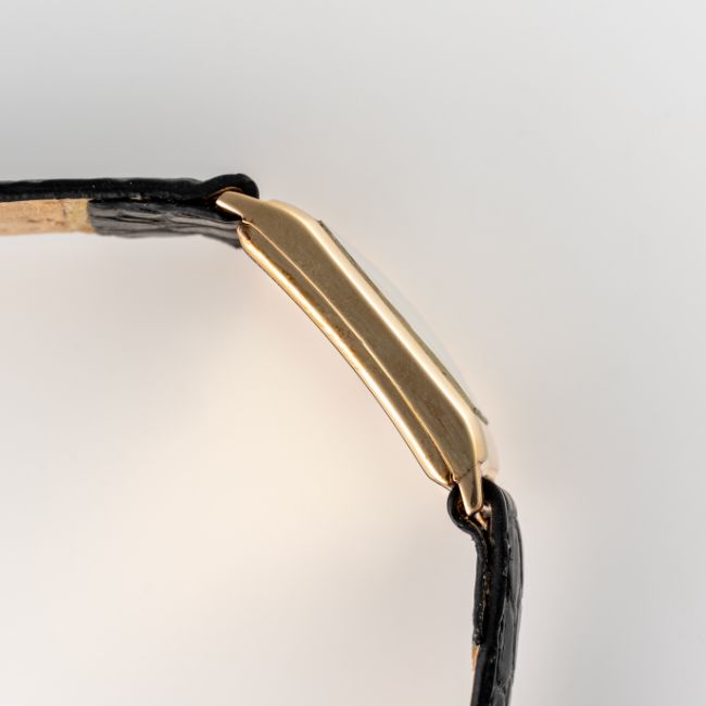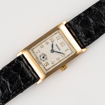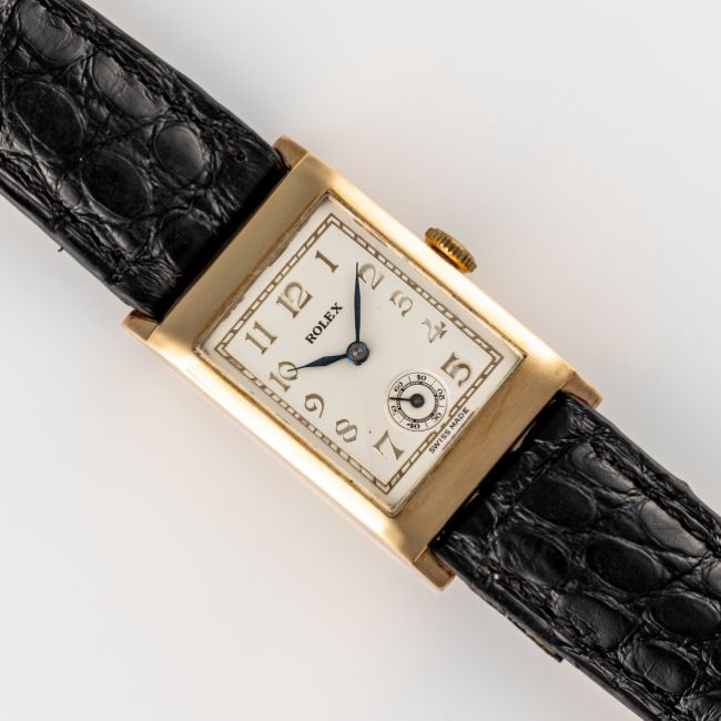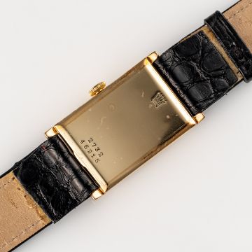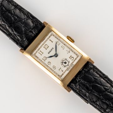 A GENTLEMAN'S SIZE 9CT SOLID GOLD ROLEX RECTANGULAR WRIST WATCHCIRCA 1930s, REF. 2732 Movement: 15J, manual wind, signed Rolex Ultra Prima.Case: Measures approx. 36mm by 22mm including the lugs, two piece case, signed Rolex 31 Records Universals, 9ct hallmarks, Rolex coronet embossed, numbered. Strap: Leather. CONDITION REPORTDial: Refinished dial in excellent condition.Movement: Running & functioning at present, timekeeping and accuracy cannot be guaranteed.Case: In very good condition, with some light scratches due to general use.Strap/Bracelet: In very good condition.