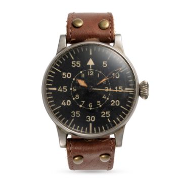 A RARE GERMAN MILITARY LUFTWAFFE B.UHR A. LANGE & SOHNE NAVIGATORS OBSERVATION PILOTS WATCH CIRCA 1940s, REF. FL23883 "TYPE B" DIAL Movement: Manual wind, signed. A. Lange & Söhne, numbered 215610.Case: Diameter approx. 55mm, fixed bars, snap back, inside case back marked Beobachtungsuhr - Bauart Lange & Söhne, Gerat Nr 127-560A-1, Werk Nr 215610, Anforderz FL 23883 (matching case middle number), outer case back numbers matching movement number. Strap. Leather. CONDITION REPORTDial: Original dial in very good condition, showing some signs of age.Movement: Running & functioning at present, timekeeping and accuracy cannot be guaranteed.Case: In very good condition, with some light wear and scratches due to general use.Strap/Bracelet: In excellent condition.
